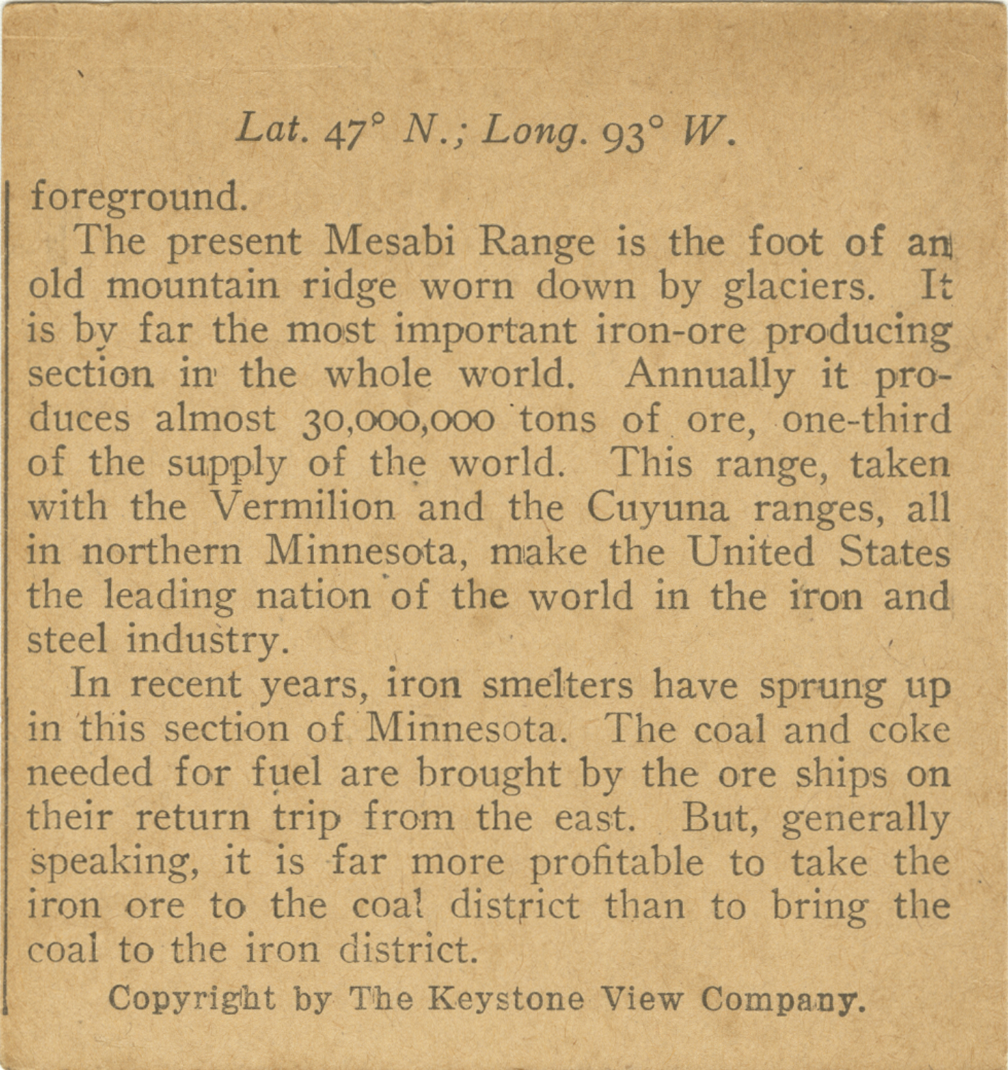 foreground. The present Mesabi Range is the foot of an old mountain ridge worn down by glaciers. It is by far the most important iron-ore producing section in the whole world. Annually it produces almost 30,000,000 tons of ore, one-third of the supply of the world. This range, taken with the Vermilion and the Cuyuna ranges, all in northern Minnesota, make the United States the leading nation of the world in the iron and steel industry. In recent years, iron smelters have sprung up in this section of Minnesota. The coal and coke needed for fuel are brought by the ore ships on their return trip from the east. But, generally speaking, it is far more profitable to take the iron ore to the coal district than to bring the coal to the iron district.