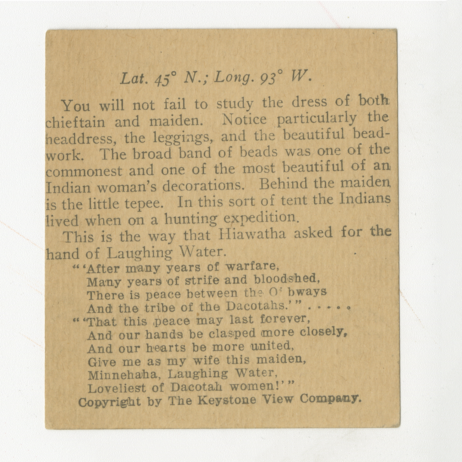 You will not fail to study the dress of both chieftain and maiden. Notice particularly the headdress, the leggings, and the beautiful beadwork. The broad band of beads was one of the commonest and one of the most beautiful of an Indian woman's decorations. Behind the maiden is the little tepee. In this sort of tent the Indians lived when on a hunting expediation. This is the way that Hiawatha asked for the hand of Laughing Water. "'After many years of warfare, Many years of strife and bloodshed, There is peace between the Ojibways And the tribe of the Dacotahs.'"..... "'That this peace may last forever, And our hands be clasped more closely, And our hearts be more united, Give me as my wife this maiden, Minnehaha, Laughing Water, Loveliest of Dacotah women!'"