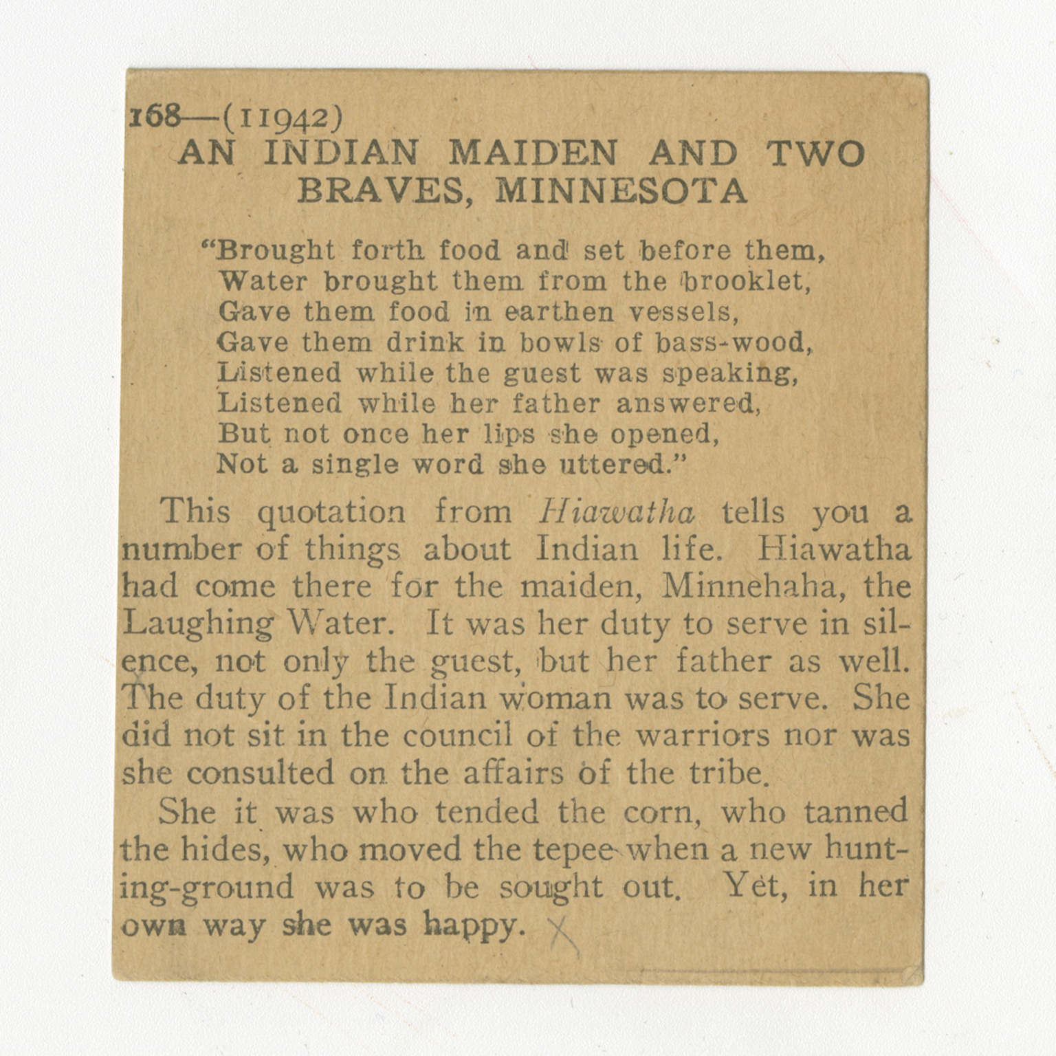 "Brought forth food and set before them, Water brought them from the brooklet, Gave them food in eastern vessels, Gave them drink in bowls of bass-wood, Listening while the guest was speaking, Listened while her father answered, But not once her lips she opened, Not a single word she uttered." This quotation from Hiawatha tells you a number of things about Indian life. Hiawatha had come there for the maiden, Minnehaha, the Laughing Water. It was her duty to serve in silence, not only the guest, but her father as well. The duty of the Indian woman was to serve. She did not sit in the council of the warriors nor was she consulted to the affairs of the tribe. She it was who tended the corn, who tanned the hides, who moved the tepee when a new hunting-ground was to be sought out. Yet, in her own way she was happy.