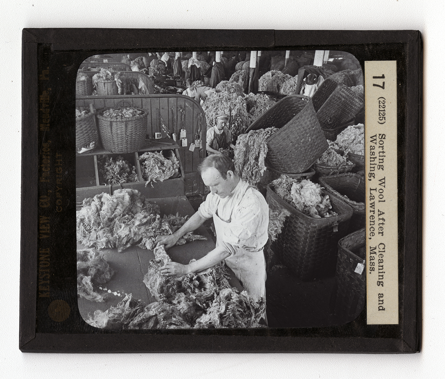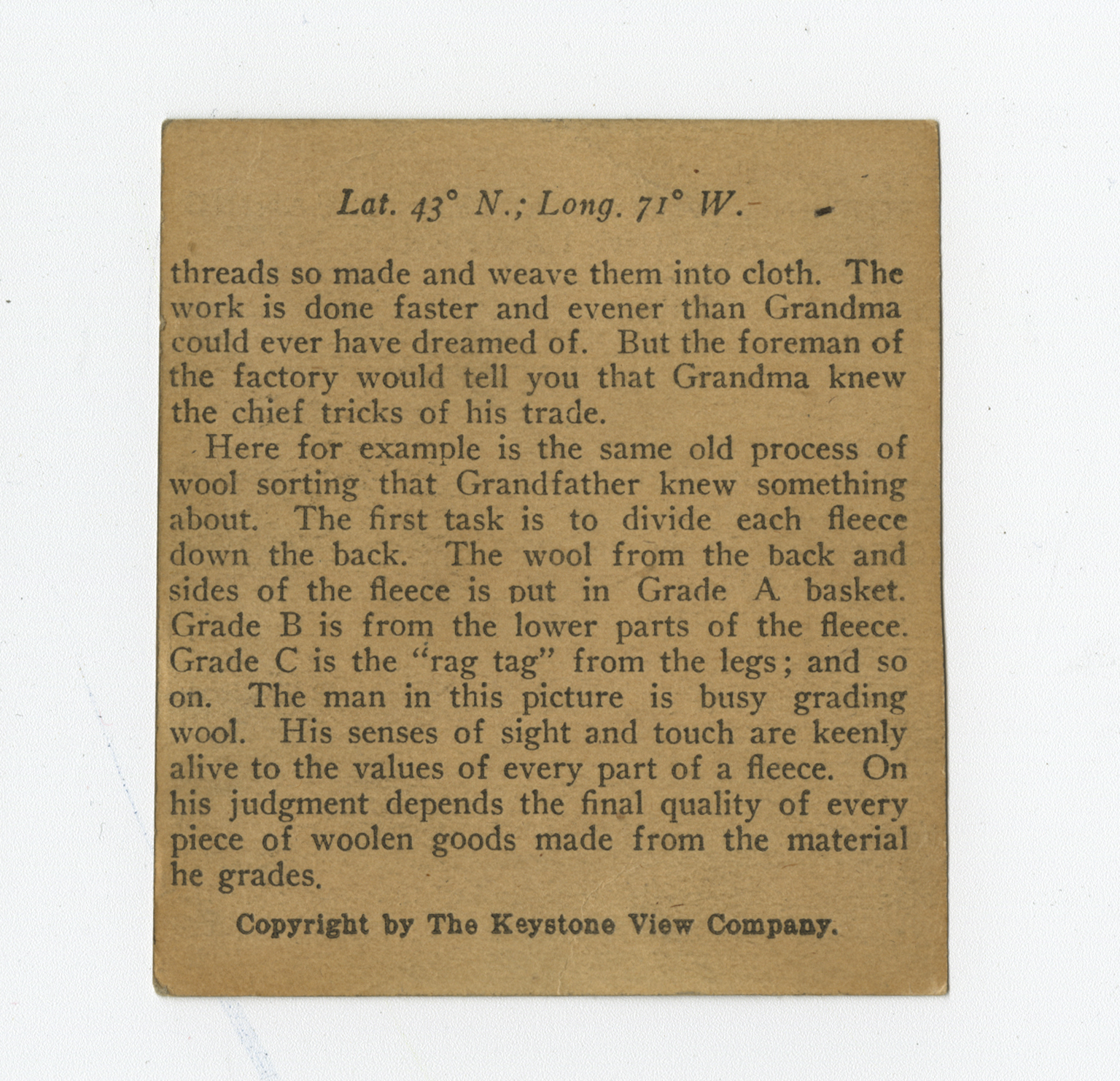 threads so made and weave them into cloth. The work is done faster and evener than Grandma could ever have dreamed of. But the foreman of the factory would tell you that Grandma knew the chief tricks of his trade. Here for example is the same old process of wool sorting that Grandfather knew something about. The first task is to divide each fleece down the back. The wool from the back and sides of the fleece is put in Grade A basket. Grade B is from the lower parts of the fleece. Grade C is the "rag tag" from the legs; and so on. The man in this picture is busy grading wool. His senses of sight and touch are keenly alive to the values of every part of a fleece. On his judgement depends the final quality of every piece of woolen goods made from the material he grades.