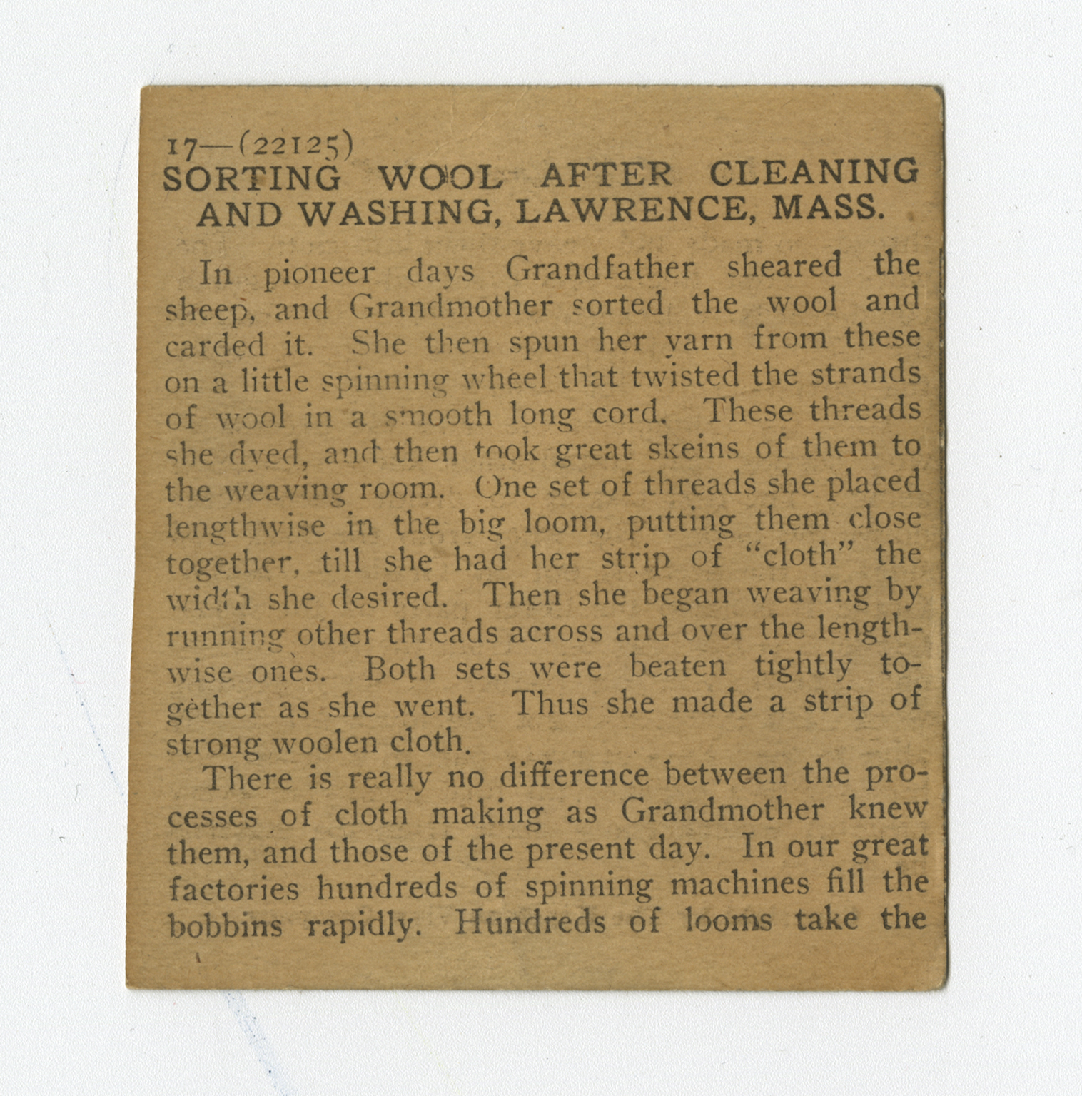 In pioneer days Grandfather sheared the sheep, and Grandmother sorted the wool and carded it. She then spun her yarn from these on a little spinning wheel that twisted the strands of wool in a smooth long cord. These threads she dyed, and then took great skeins of them to the weaving room. One set of threads she placed lengthwise in the big loom, putting them close together, till she had her strip of "cloth" the width she desired. Then she began weaving by running other threads across and over the lengthwise ones. Both sets were beaten tightly together as she went. Thus she made a strip of strong woolen cloth. There is really no difference between processes of cloth making as Grandmother knew them, and those of the present day. In our great factories hundreds of spinning machines fill the bobbins rapidly. Hundreds of looms take the