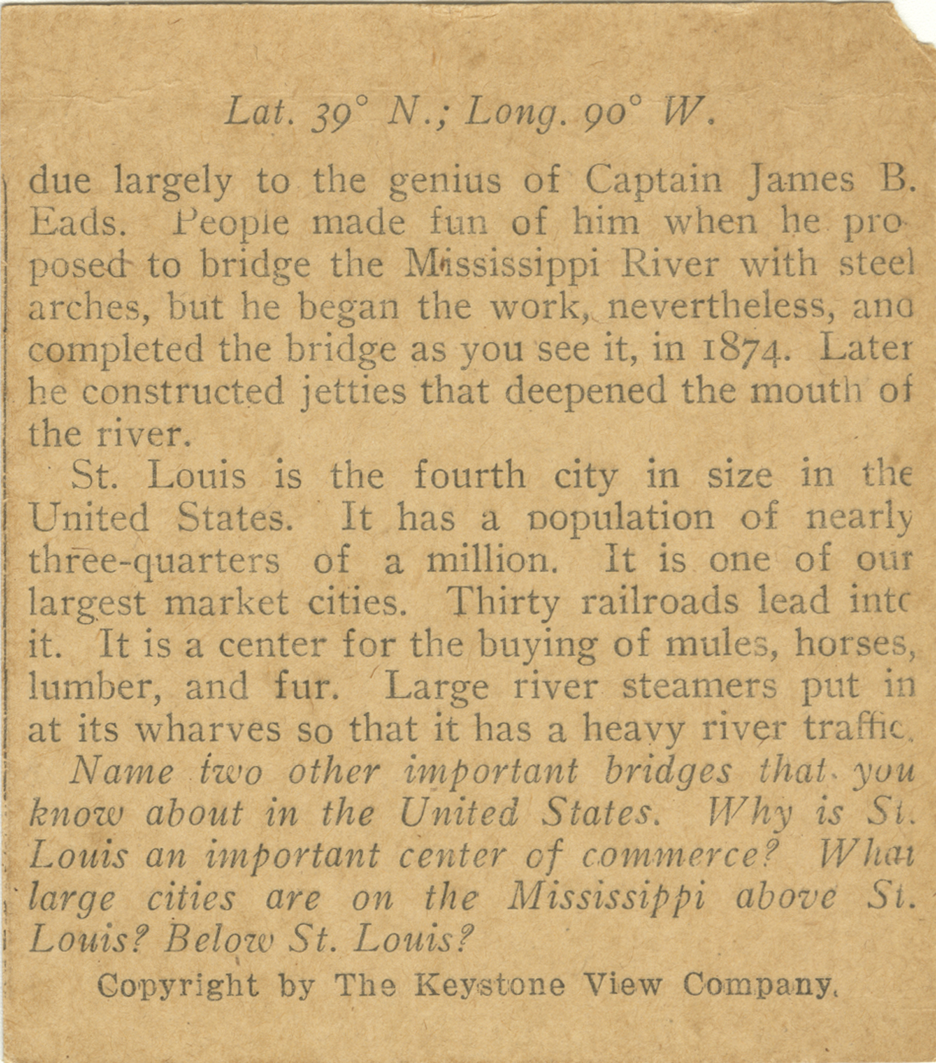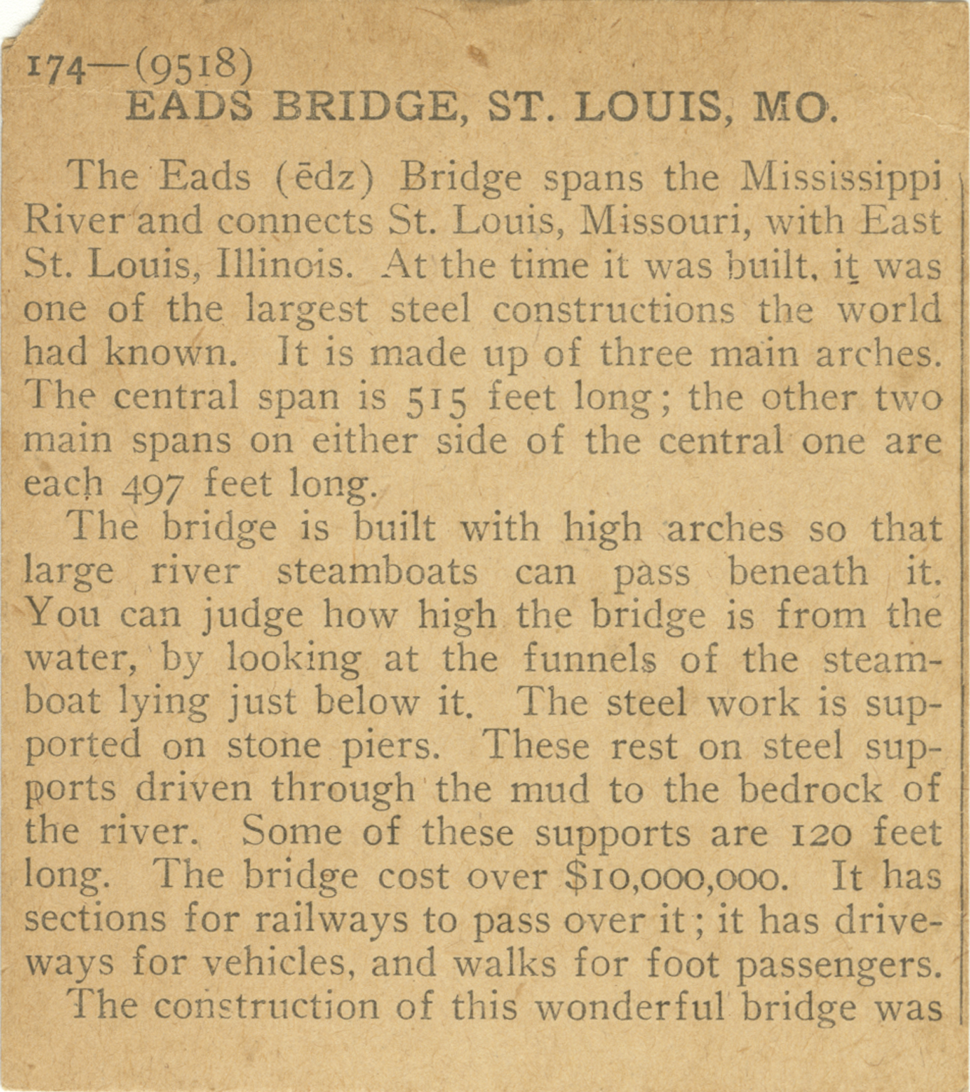 The Eads Bridge spans the Mississippi River and connects St. Louis, Missouri, with East St. Louis, Illinois. At the time it was built, it was one of the largest steel constructions the world had known. It is made up of three main arches. The central span is 515 feet long; the other two main spans on either side of the central one are each 497 feet long. The bridge is built with high arches so that large river steamboats can pass beneath it. You can judge how high the bridge is from the water, by looking at the funnels of the steamboat lying just below it. The steel work is supported on stone piers. These rest on steel supports driven through the mud to the bedrock of the river. Some of these supports are 120 feet long. The bridge cost over $10,000,000. It has sections for railways to pass over it; it has driveways for vehicles, and walks for foot passengers. The construction of this wonderful bridge was