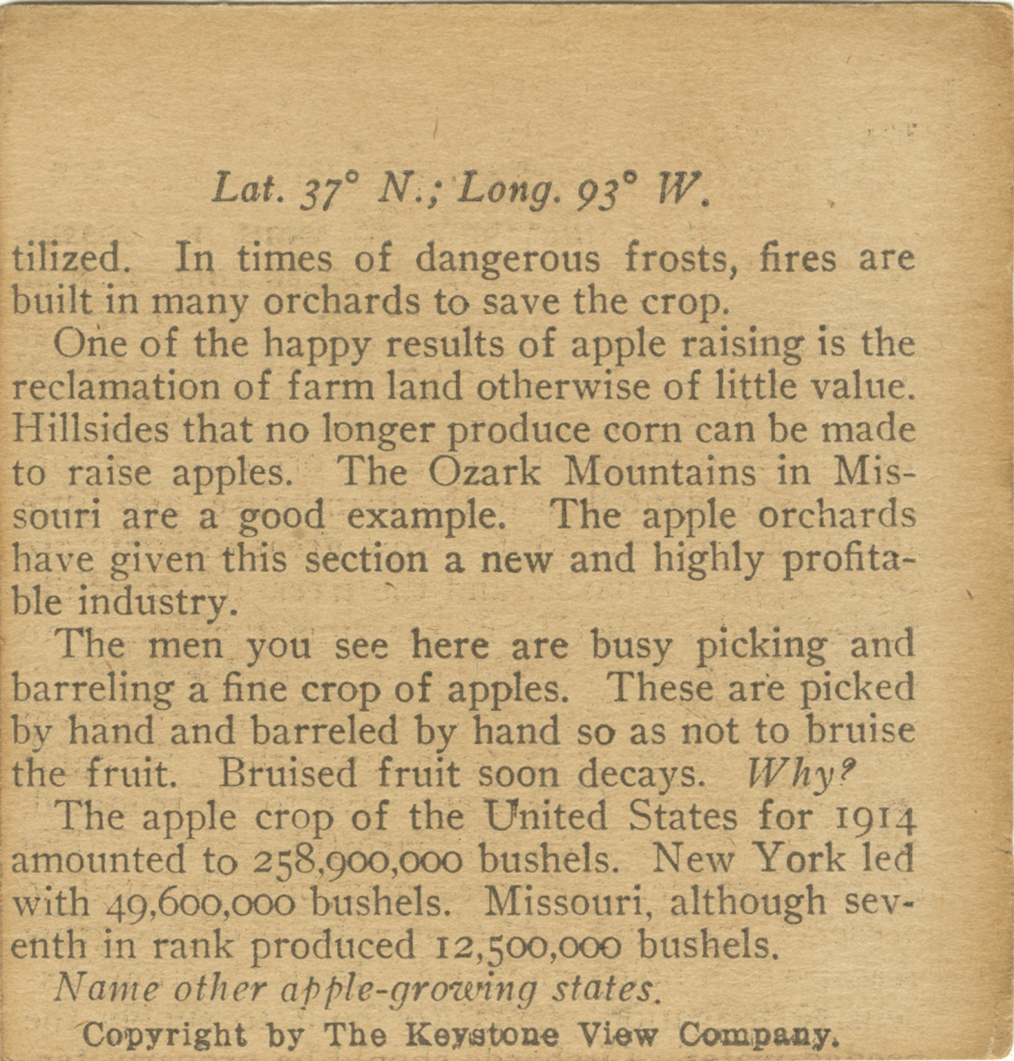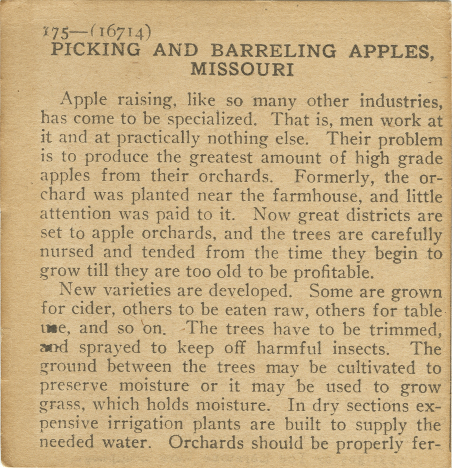 tilized. In times of dangerous frosts, fires are built in many orchards to save the crop. One of the happy results of apple raising is the reclamation of farm land otherwise of little value. Hillsides that no longer produce corn can be made to raise apples. The Ozark Mountains in Missouri are a good example. The apple orchards have given this section a new and highly profitable industry. The men you see here are busy picking and barreling a fine crop of apples. These are picked by hand and barreled by hand so as not to bruise the fruit. Brusied fruit soon decays. Why? The apple crop of the United States for 1914 amounted to 258,900,00 bushels. New York led with 49,600,000 bushels. Missouri, although seventh in rank produced 12,500,000 bushels. Name other apple-growing states.