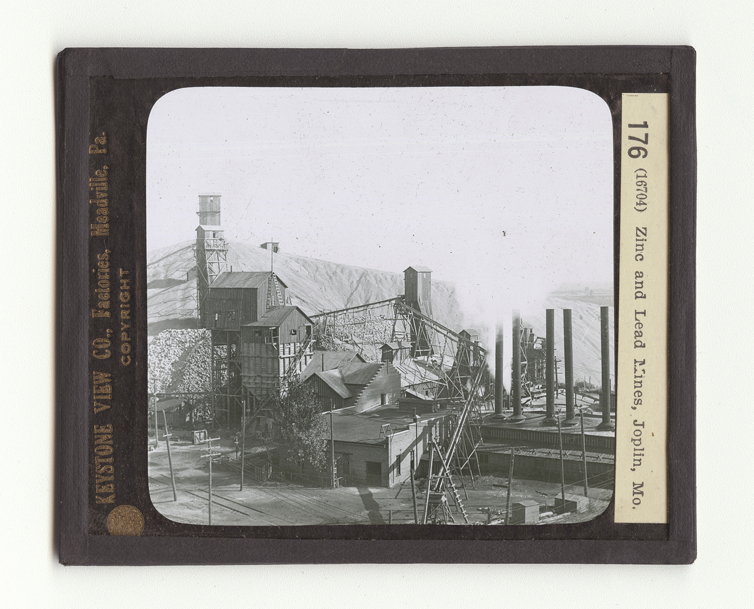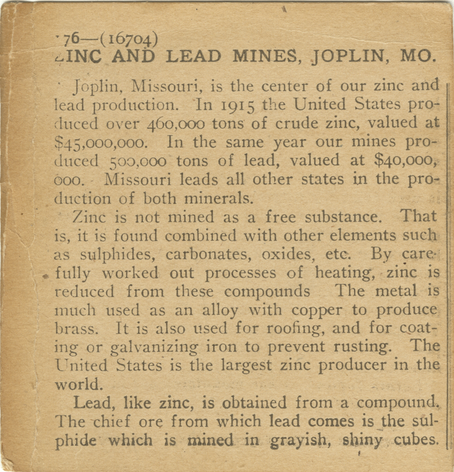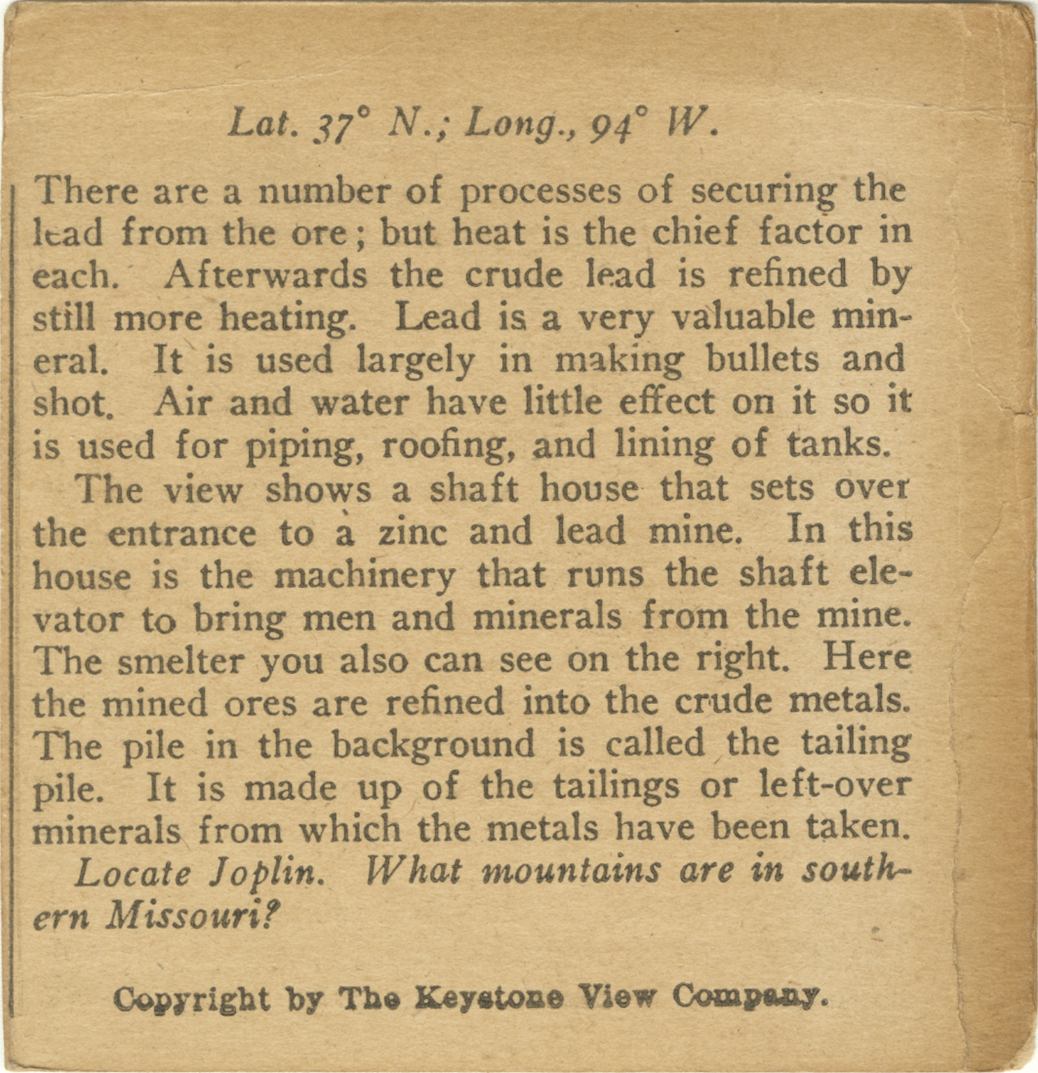 There are a number of processes of securing the lead from the ore; but heat is the chief factor in each. Afterwards the crude lead is refined by still more heating. Lead is a very valuable mineral. It is used largely in making bullets and shot. Air and water have little effect on it so it is used for piping, roofing, and lining of tanks. The view shows a shaft house that sets over the entrance to a zinc and lead mine. In this house is the machinery that runs the shaft elevator to bring men and minerals from the mine. The smelter you also can see on the right. Here the mined ores are refined into the crude metals. The pile in the background is called the tailing pile. It is made up of the tailings or left-over minerals from which the metals have been taken. Locate Joplin. What mountains are in southern Missouri?