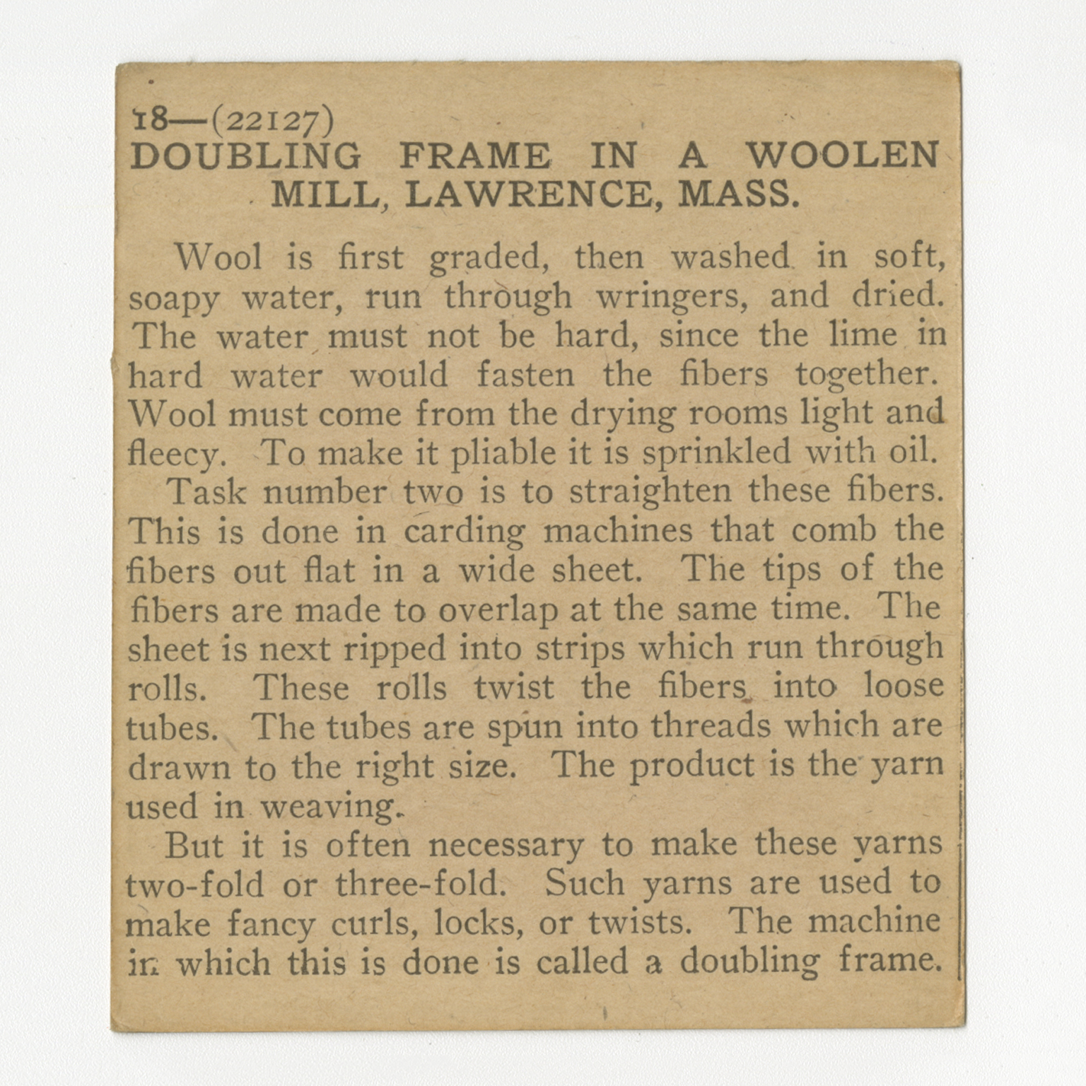 Wool is first graded, then washed in soft, soapy water, run through wringers, and dried. The water must not be hard, since the lime in hard water would fasten the fibers together. Wool must come from the drying rooms light and fleecy. To make it pliable it is sprinkled with oil. Task number two is to straighten these fibers. This is done in carding machines that comb the fibers out flat in a wide sheet. The tips of the fibers are made to overlap at the same time. The sheet is next ripped into strips which run through rolls. These rolls twist the fibers into loose tubes. The tubes are spun into threads which are drawn to the right size. The product is the yarn used in weaving. But it is often necessary to make these yarns two-fold or three-fold. Such yarns are used to make fancy curls, locks, or twists. The machine in which this is done is called a doubling frame.