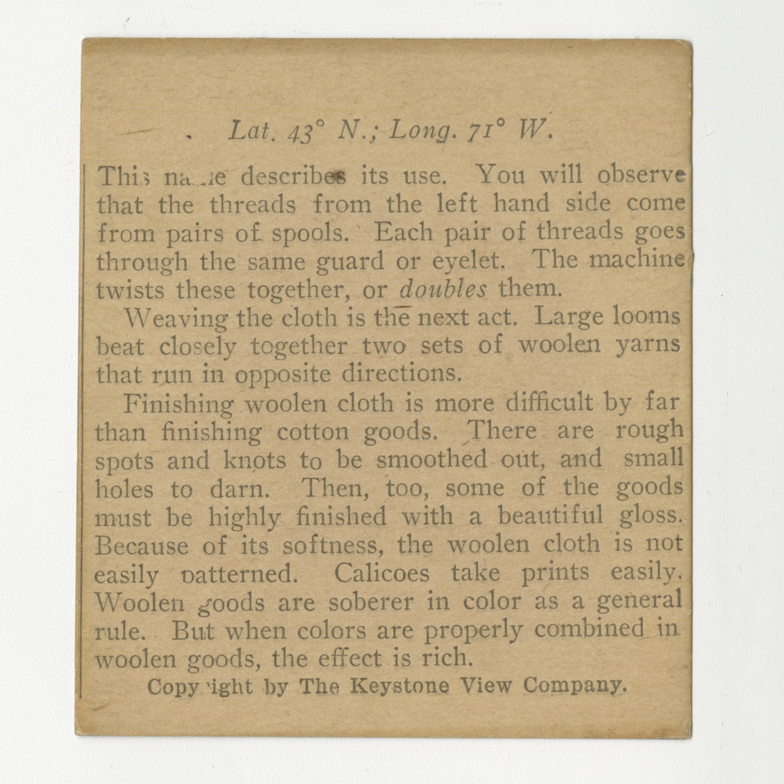 This name describes its use. You will observe that the threads from the left hand side come from pairs of spools. Each pair of threads goes through the same guard or eyelet. The machine twists these together, or doubles them. Weaving the cloth is the next act. Large looms beat closely together two sets of woolen yarns that run in opposite directions. Finishing woolen cloth is more difficult by far than finishing cotton goods. There are rough spots and knots to be smoothed out, and small holes to darn. Then, too, some of the goods must be highly finished with a beautiful gloss. Because of its softness, the woolen cloth is not easily patterned. Calicoes take prints easily. Woolen goods are soberer in color as a general rule. But when colors are properly combined in woolen goods, the effect is rich.