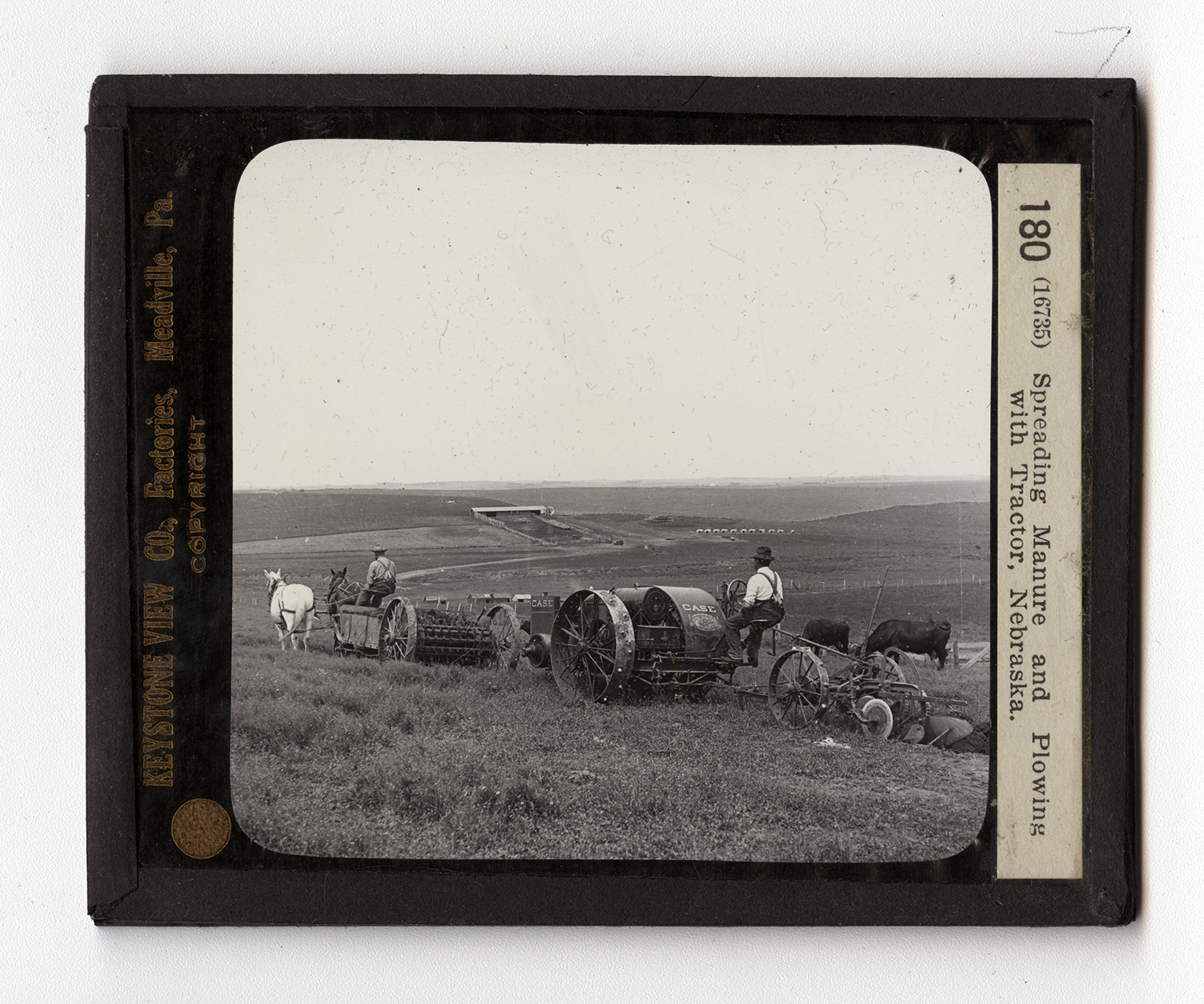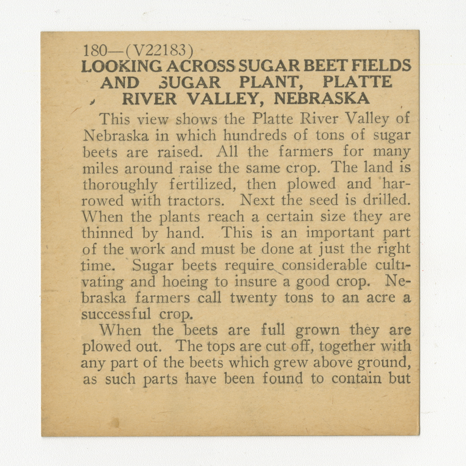 This view shows the Platte River Valley of Nebraska in which hundreds of tons of sugar beets are raised. All the farmers for many miles around raise the same crop. The land is thoroughly fertilized, then plowed and harrowed with tractors. Next the seed is drilled. When the plants reach a certain size they are thinned by hand. This is an important part of the work and must be done at just the right time. Sugar beets require considerable cultivating and hoeing to insure a good crop. Nebraska farmers call twenty tons to an acre a succsesful crop. When the beets are full grown they are plowed out. The tops are cut off, together with any apart of the beets which grew above ground, as such parts have been found to contain but