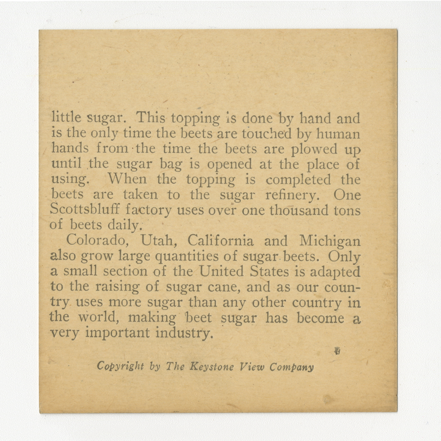 little sugar. This topping is done by hand and is the only time the beets are touched by human hands from the time the beets are plowed up until the sugar bag is opened at the place of using. When the topping is completed the beets are taken to the sugar refinery. One Scottsbluff factory uses over one thousands tons of beets daily. Colorado, Utah, California and MIchigan also grow large quanities of sugar beets. Only a small section of the United States is adapted to the raising of sugar cane, and as our country uses more sugar than any other country in the world, making beet sugar has become a very important industry.