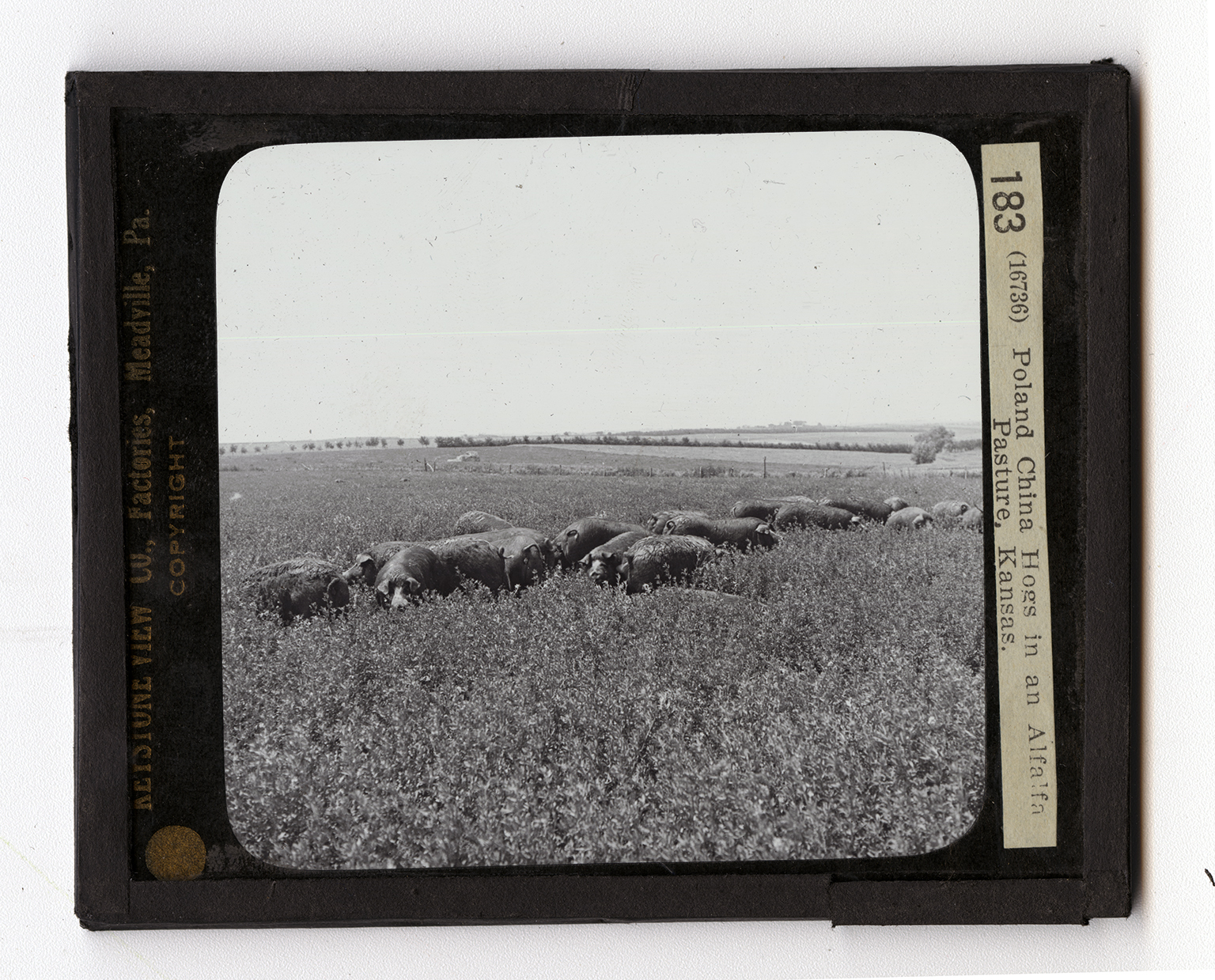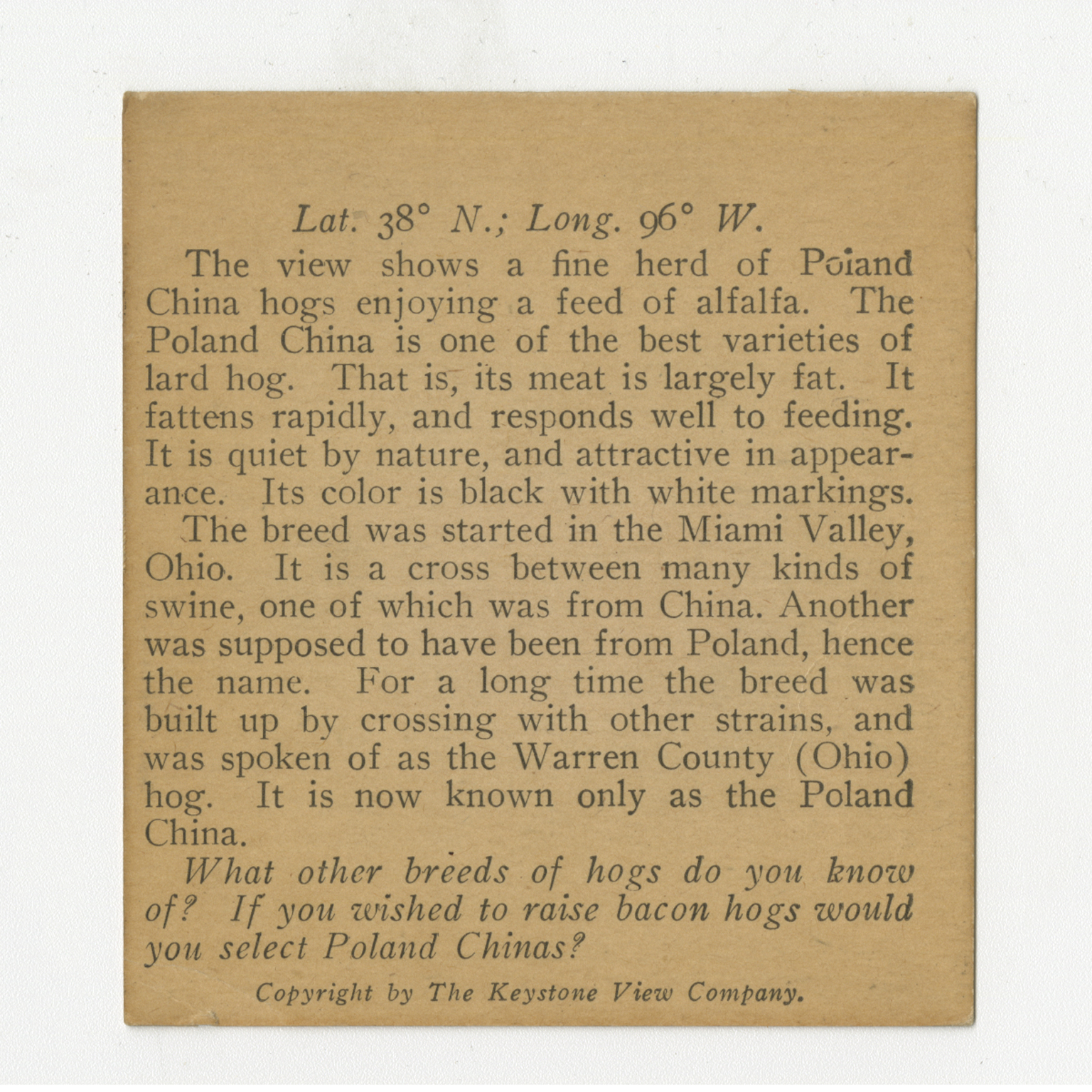The view shows a fine herd of Poland China hogs enoying a feed of alfalfa. The Poland China is one of the best varieties of lard hog. That is, its meat is largely fat. It fattens rapidly, and responds well to feeding. It is quiet by nature, and attractive in appearance. Its color is black with white markings. The breed was started in the Miami Valley, Ohio. It is a cross between many kinds of swine, one of which was from China. Another was supposed to have been from Poland, hence the name. For a long time the breed was built up by crossing with other strains, and was spoken of as the Warren County (Ohio) hog. It is now known only the Poland China. What other breeds of hogs do you know of? If you wished to raise bacon hogs would you select Poland Chinas?