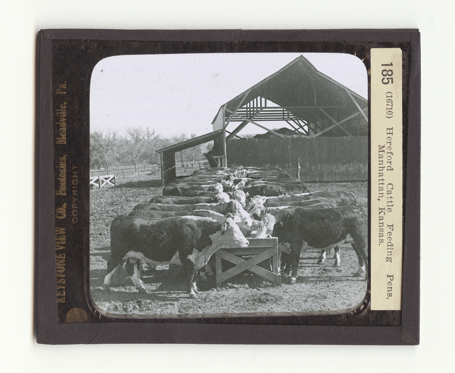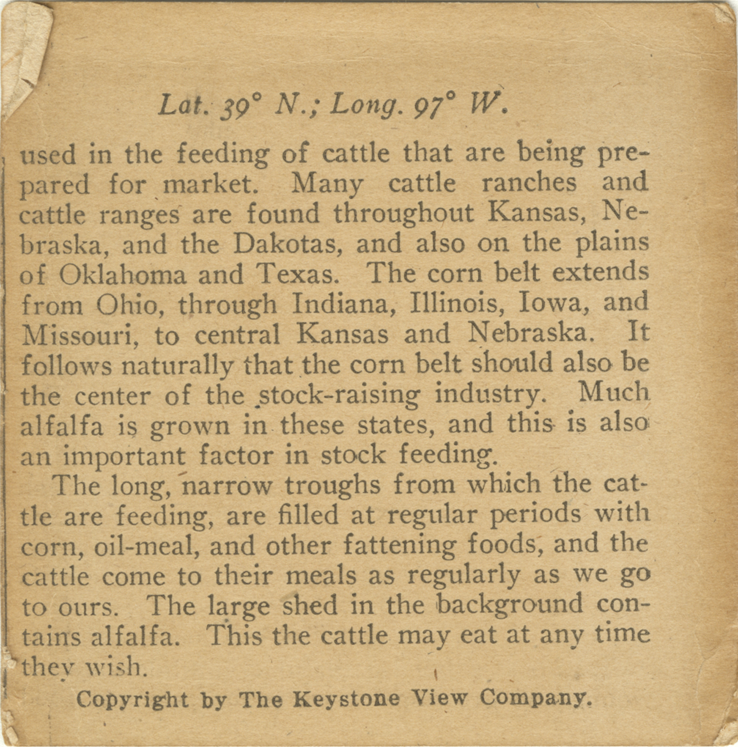 used in the feeding of cattle that are being prepared for market. Many cattle ranches and cattle ranges are found throughout Kansas, Nebraska, and the Dakotas, and also on the plains of Oklahoma and Texas. The corn belt extends from Ohio, through Indiana, Illinois, Iowa, and Missouri, to central Kansas and Nebraska. It follows naturally that the corn belt should also be the center of the stock-raising industry. Much alfalfa is grown in these states, and this is an important factor in stock feeding. The long, narrow troughs from which the cattle are feeding, are filled at regular periods with corn, oil-meal, and other fattening foods, and the cattle come to their meals as regularly as we go to ours. THe large shed in the background contains alfalfa. This the cattle may eat at any time they wish.