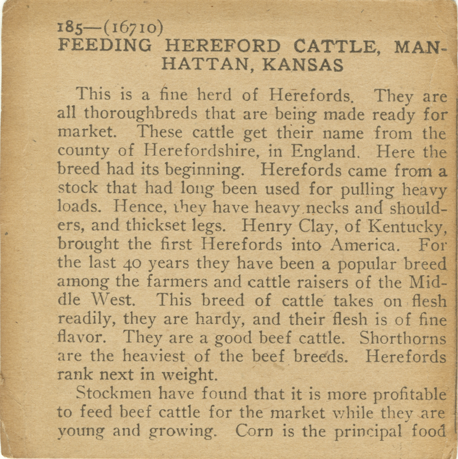 This is a fine herd of Herefords. They are all thoroughbreds that are being made ready for market. These cattle get their name from the county of Herefordshire, in England. Here the breed had its beginning. Herefords came from a stock that had long been used for pulling heavy loads. Hence, they have heavy necks and shoulders, and thickest legs. Henry Clay, of Kentucky, brought the first Herefords into America. For the last 40 years theyhave been a popular breed among the farmers and cattle raisers of the Middle West. This breed of cattle takes on flesh readily, they are hardy, and their flesh is of fine flavor. THey are a good beef cattle. Shorthorns are the heaviest of the beef breeds. Herefords rank next in weight. Stockmen have found that it is more profitable to feed beef cattle for the market while they are young and growing. Corn is the principal food