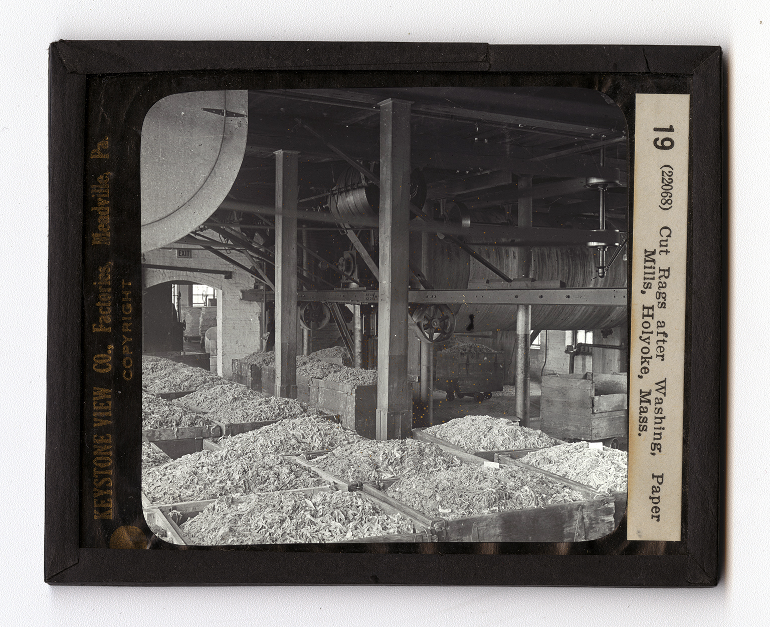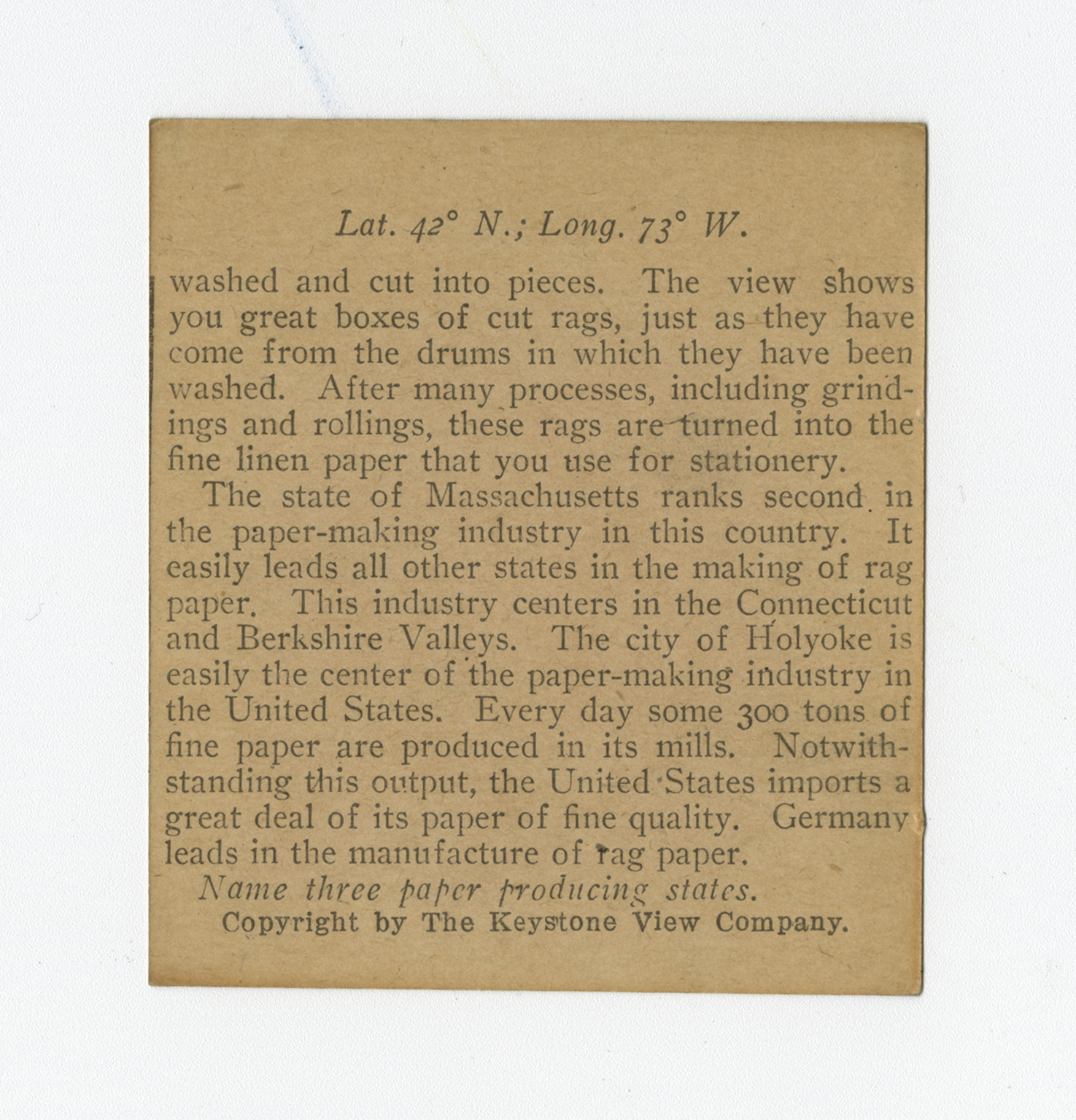 washed and cut into pieces. The view shows you great boxes of cut rags, just as they have come from the drums in which they have been washed. After many processes, including grindings and rollings, these rags are turned into the fine linen paper that you use for stationery. The state of Massachusetts ranks second in the paper-making industry in this country. It easily leads all other states in the making of rag paper. This industry centers in the Connecticut and Berkshire Valleys. The city of Holyoke is easily the center of the paper-making industry in the United States. Every day some 300 tons of fine paper are produced in its mills. Notwithstanding this output, the United States imports a great deal of its paper of fine quality. Germany leads in the manufacture of rag paper. Name three paper producing states.