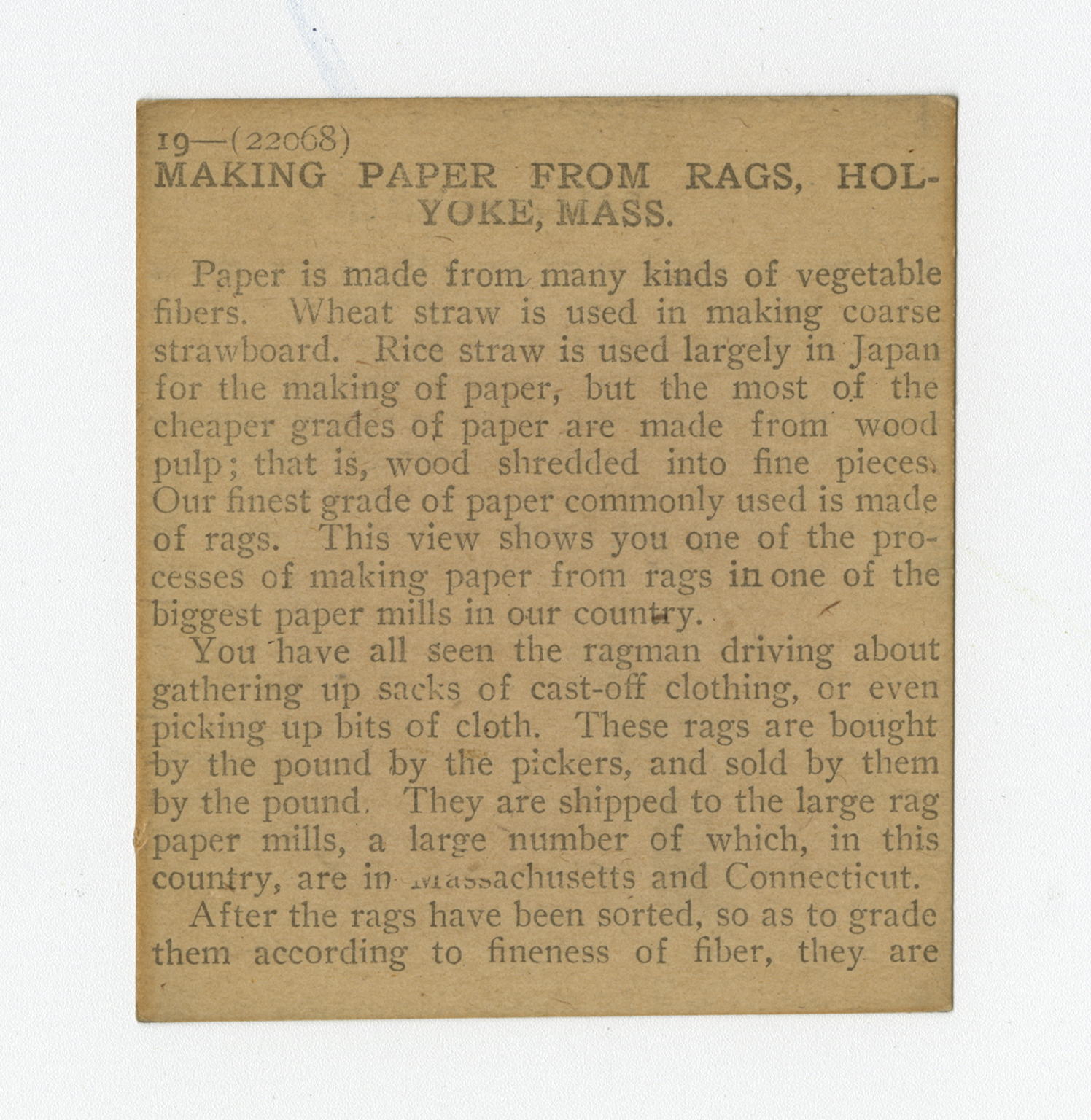 Paper is made from many kinds of vegetable fibers. Wheat straw is used in making coarse strawboard. Rice straw is used largely in Japan from the making of paper, but the most of the cheaper grades of paper are made from wood pulp; that is, wood shredded into fine pieces. Our finest grade of paper commonly used is made of rags. This view shows you one of the processes of making paper from rags in one of the biggest paper mills in our country. You have all seen the ragman driving about gathering up sacks of cast-off clothing, even picking up bits of cloth. These rags are bought by the pound by the pickers, and sold by them by the pound. They are shipped to the large rag paper mills, a large number of which, in this country, are in Massachusetts and Connecticut. After the rags have been sorted, so as to grade them according to fineness of fiber, they are