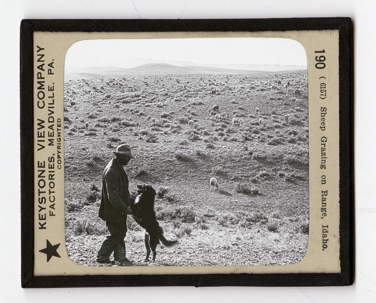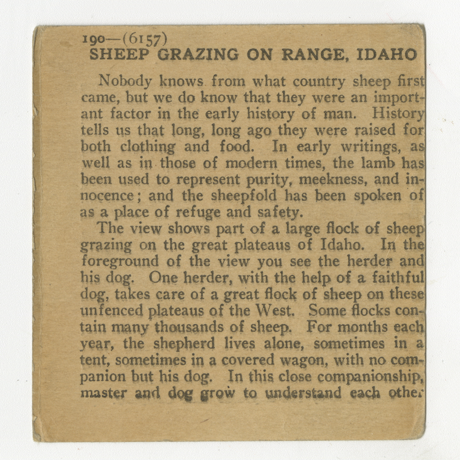 Nobody knows from what country sheep first came, but we do know that they were an important factor in the early history of man. History tells us that long, long ago they were raised for both clothing and food. In early writings, as well as in those of modern times, the lamb has been used to represent purity, meekness, and innocence; and the sheepfold has been spoken of as a place of refuge and safety. The view shows part of a large flock of sheep grazing on the great plateaus of Idaho. In the foreground of the view you see the herder and his dog. One herder, with the help of a faithful dog, takes care of a great flock of sheep on these unfenced plateaus of the West. Some flocks contain many thousands of sheep. For months each year, the shepherd lives alone, sometimes in a tent, sometimes in a covered wagon, with no companion but his dog. In this close companionship, master and dog grow to understand each other