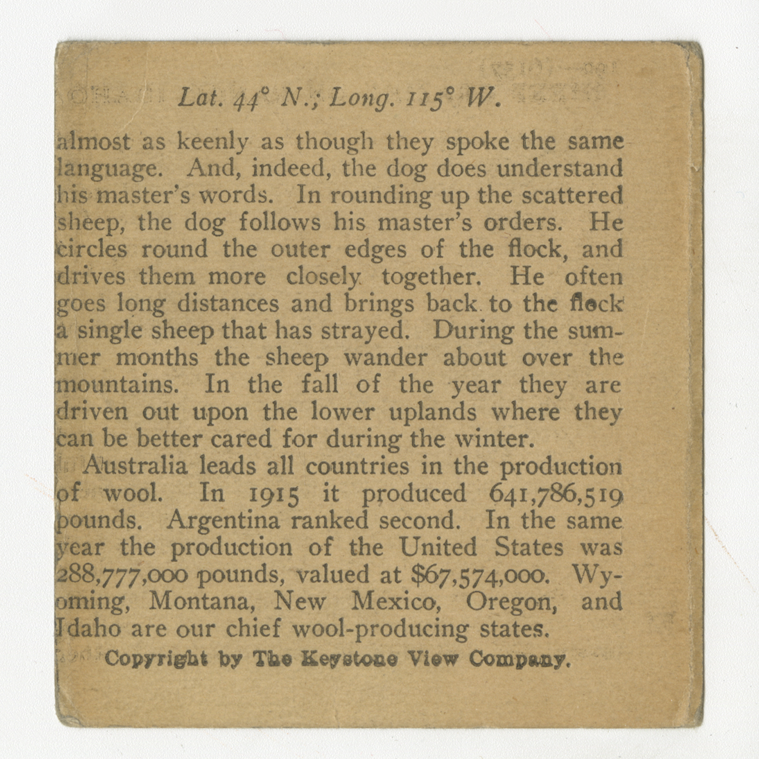 almost as keenly as though they spoke the same language. And, indeed, the dog does understand his master's words. In rounding up the scattered sheep, the dog follows his master's orders. He circles round the outer edges of the flock, and drives them more closely together. He often goes long distances and brings back to the flock a single sheep that has strayed. During the summer months the sheep wander about over the mountains. In the fall of the year they are driven out upon the lower uplands where they can be better cared for during the winter. Australia leads all countries in the production of wool. In 1915 it produced 641,786,519 pounds. Argentina ranked second. In the same year the production of the United States was 288,777,000 pounds, valued at $67,574,000. Wyoming, Montana, New Mexico, Oregon, and Idaho are our chief wool-producing states.