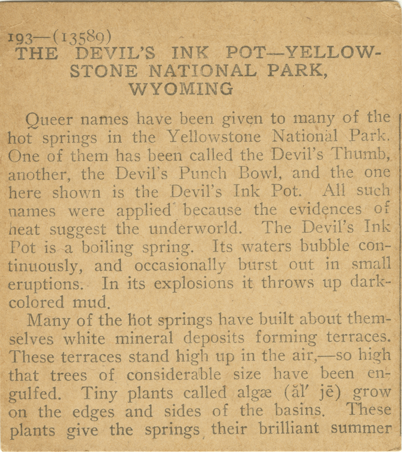 Queer names have been given to many of the hot springs in the Yellowstone National Park. One of them has been called the Devil's Thumb, another, the Devil's Punch Bowl, and the one here shown is the Devil's Ink Pot. All such names were applied because the evidences of heat suggest the underworld. The Devil's Ink Pot is a boiling spring. Its waters bubble continuously, and occasionally burst out in small eruptions. In its explosions it throws up dark-colored mud. Many of the hot springs have built about themselves white mineral deposits forming terraces. These terraces stand high up in the air - so high that trees of considerable size have been engulfed. Tiny plants called algae grow on the edges and sides of the basins. These plants give the springs their brilliant summer