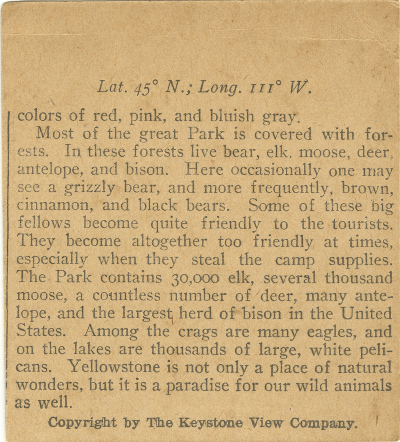 colors of red, pink, and bluish gray. Most of the great Park is covered with forests. In these forests live bear, elk, moose, deer antelope, and bison. Here occasionally one may see a grizzly bear, and more frequently brown, cinnamon, and black bears. Some of these big fellows become quite friendly to the tourists. They become altogether too friendly at times, especially when they steal the camp supplies. The Park contains 30,000 elk, several thousand moose, a countless number of deer, many antelope, and the largest herd of bison in the United States. Among the crags are many eagles, and on the lakes are thousands of large, white pelicans. Yellowstone is not only a place of natural wonders, but it is a paradise for our wild animals as well.