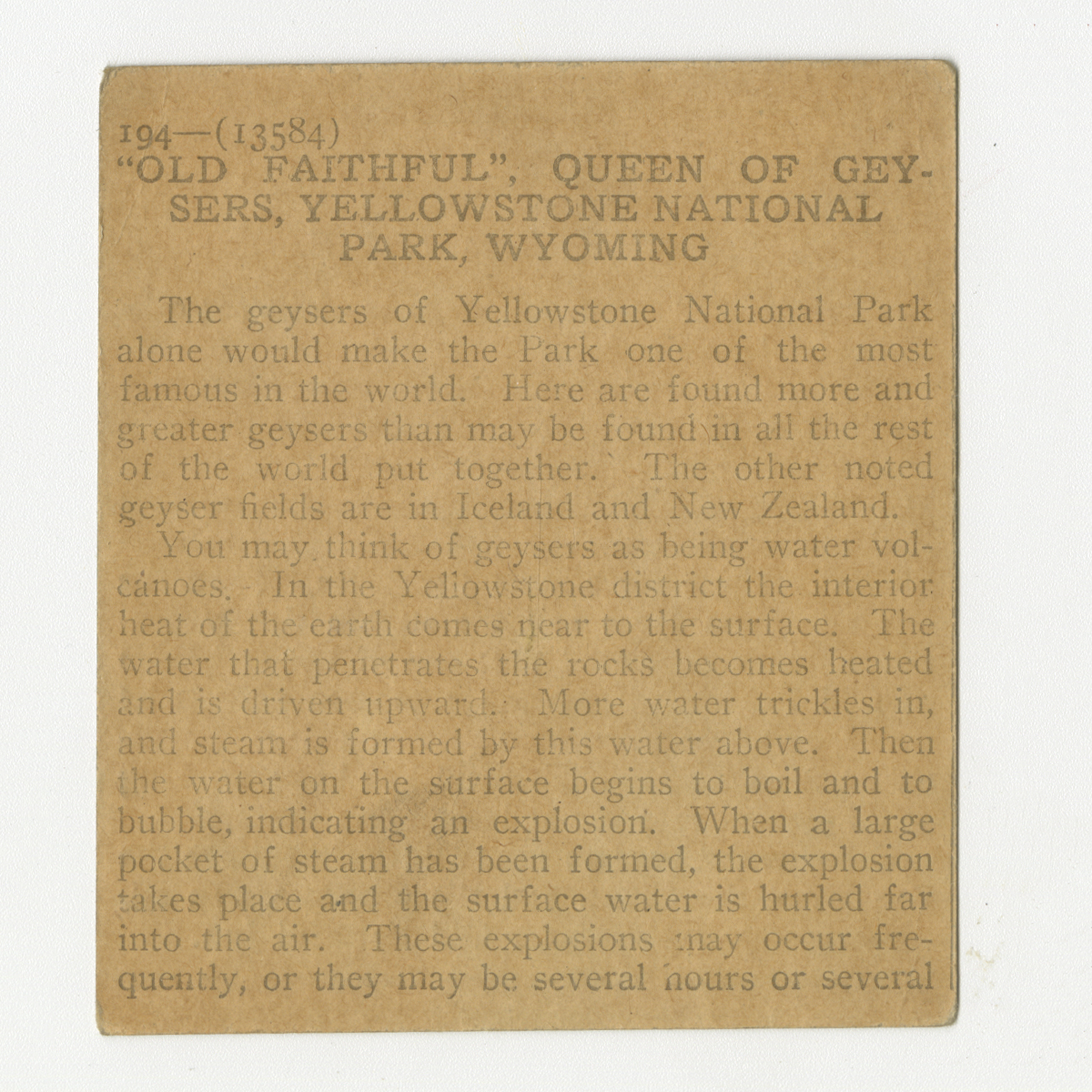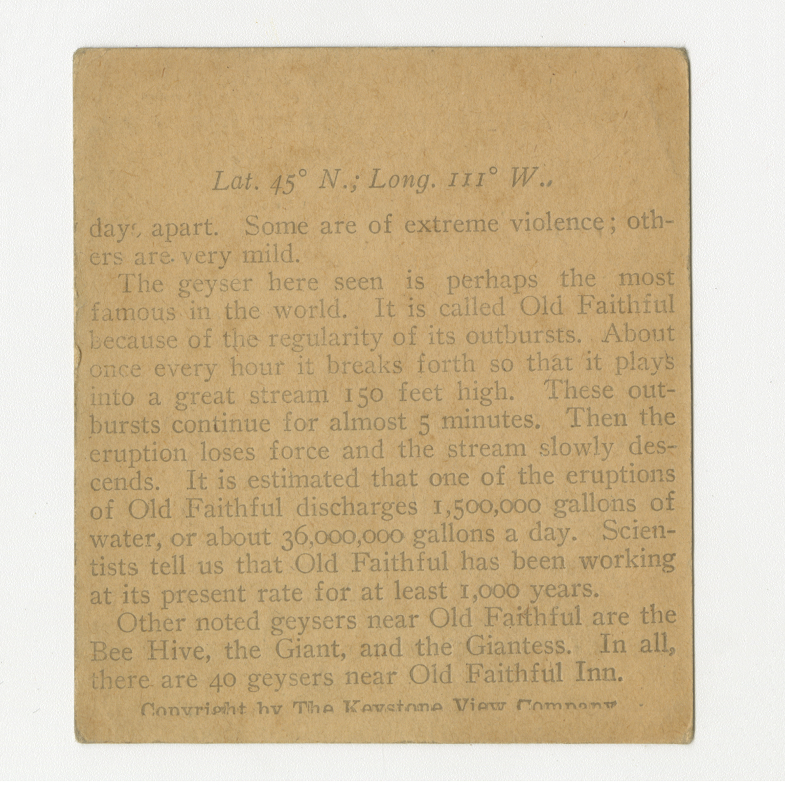 days apart. Some are of extreme violence; others are very mild. The geyser here seen is perhaps the most famous in the world. It is called Old Faithful because of the regularity of its outbursts. About once every hour it breaks forth so that it plays into a great stream 150 feet high. These outbursts continue for almost 5 minutes. Then the eruption loses force and the stream slowly descends. It is estimated that one of the eruptions of Old Faithful discharges 1,500,000 gallons of water, or about 36,000,000 gallons a day. Scientists tell us that Old Faithful has been working at its present rate for at least 1,000 years. Other noted geysers near Old Faithful are the Bee Hive, the Giant, and the Giantess. In all, there are 40 geysers near Old Faithful Inn.