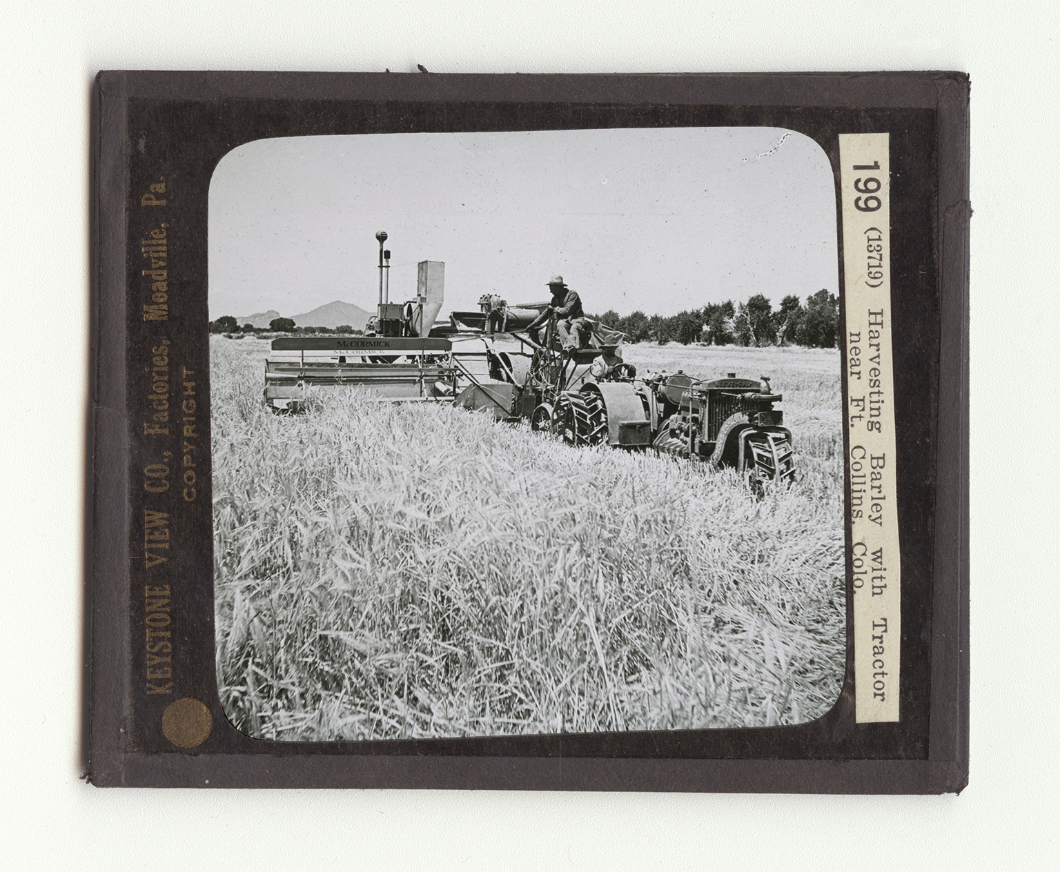 to the ground. Pulling the cutter and thresher behind it is child's play for a tractor like this. The second man oversees the other half of the machine, which works in this way. The upper part of the standing grain is driven against a sharp sickle by the revolving reel that you see to the left. The heads of grain fall on a moving canvas that carries the barley up into the thresher. There the grains are quickly beaten from the heads by heavy iron teeth. The chaff and straw are blown out behind, while the grain falls down into sacks where it is weighed, tied, and dropped on a platform. Such a machine can be used only in a dry climate. Why? Is there anything in the view to suggest that this farming country is high?