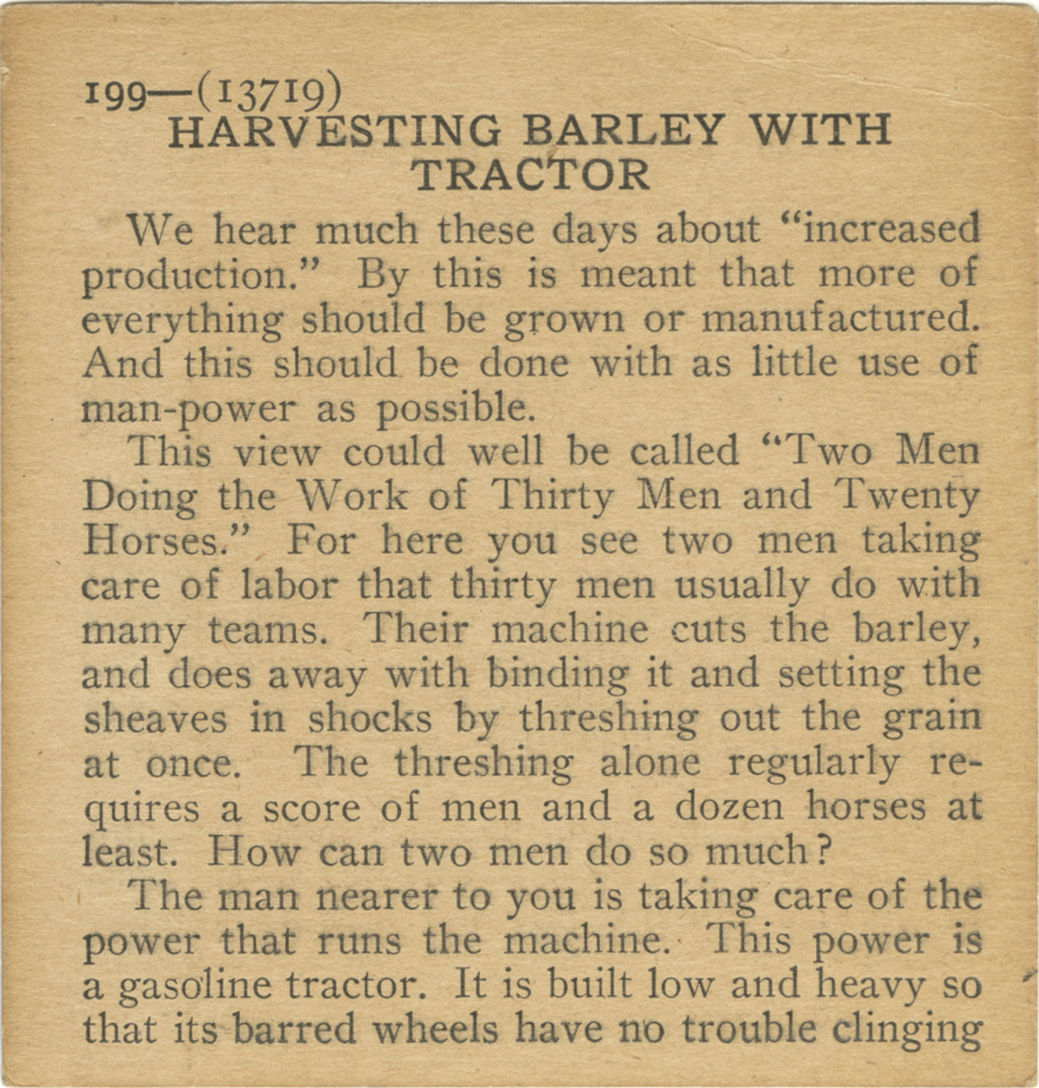 We hear much these days about "increased production." By this is meant that more of everything should be grown or manufactured. And this should be done with as little use of man-power as possible. This view could well be called "Two Men Doing the Work of Thirty Men and Twenty Horses." For here you see two men taking care of labor that thirty men usually do with many teams. Their machine cuts the barley, and does away with binding it and setting the sheaves in shocks by threshing out the grain at once. The threshing alone regularly requires a score of men and a dozen horses at least. How can two men do so much? The man nearer to you is taking care of the power that runs the machine. This power is a gasoline tractor. It is built low and heavy so that its barred wheels have no trouble clinging