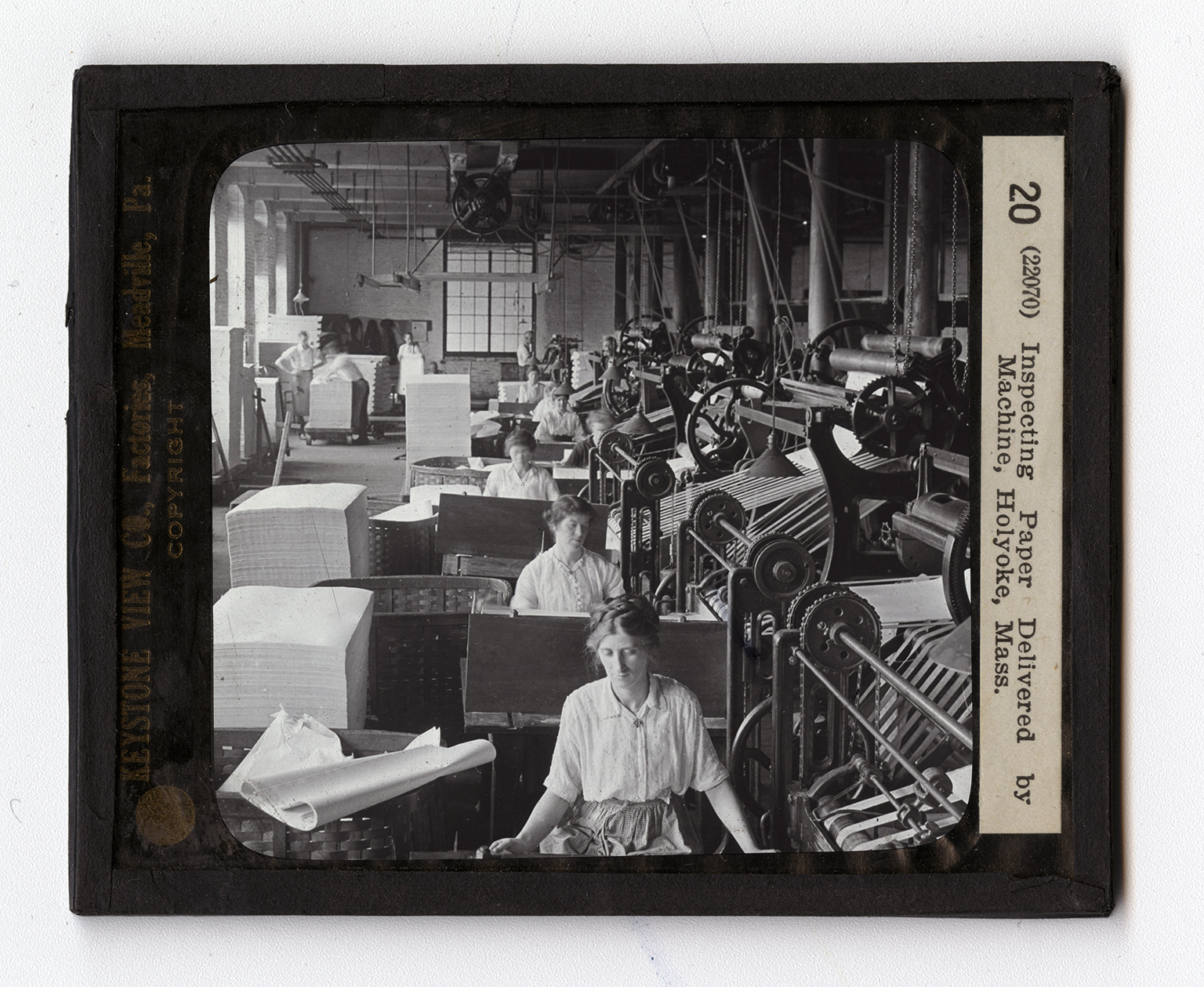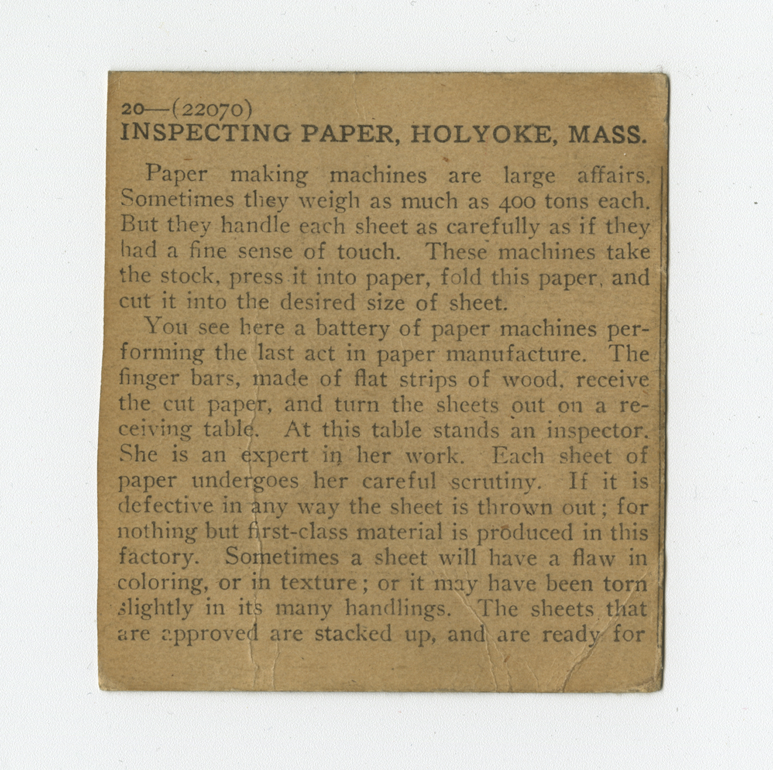 Paper making machines are large affairs. Sometimes they weigh as much as 400 tons each. But they handle each sheet as carefully as if they had fine sense of touch. These machines take the stock, press it into paper, fold this paper, and cut it into the desired size of sheet. You see here a battery of paper machines performing the last act in paper manufacture. The finger bars, made of flat strips of wood, receive the cut paper, and turn the sheets out on a receiving table. At this table stands an inspector. She is an expert in her work. Each sheet of paper undergoes her careful scrutiny. If it is defective in any way the sheet is thrown out; for nothing but first-class material is produced in this factory. Sometimes a sheet will have a flaw in coloring, or in texture; or it may have been torn slightly in its many handlings. The sheets that are approved are stacked up, and are ready for