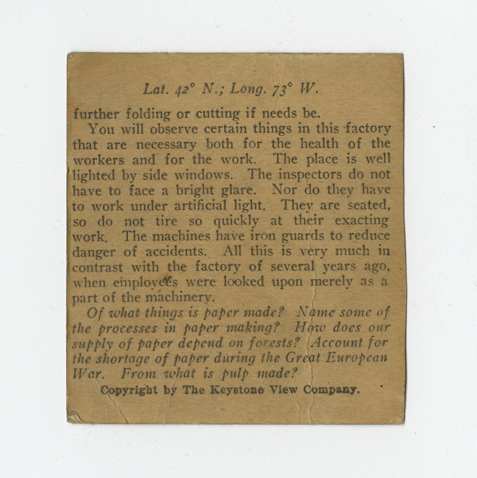 further folding or cutting if needs be. You will observe certain things in this factory that are necessary both for the health of the workers and for the work. The place is well lighted by side windows. The inspectors do not have to face a bright glare. Nor do they have to work under artificial light. They are seated, so do not tire so quickly at their exacting work. The machines have iron guards to reduce danger of accidents. All this is very much in contrast with the factory of several years ago, when employees were looked upon merely as a part of machinery. Of what things is paper made? Name some of the processes in paper making? How does our supply of paper depend on forests? Account for the shortage of paper during the Great European War. From what is pulp made?