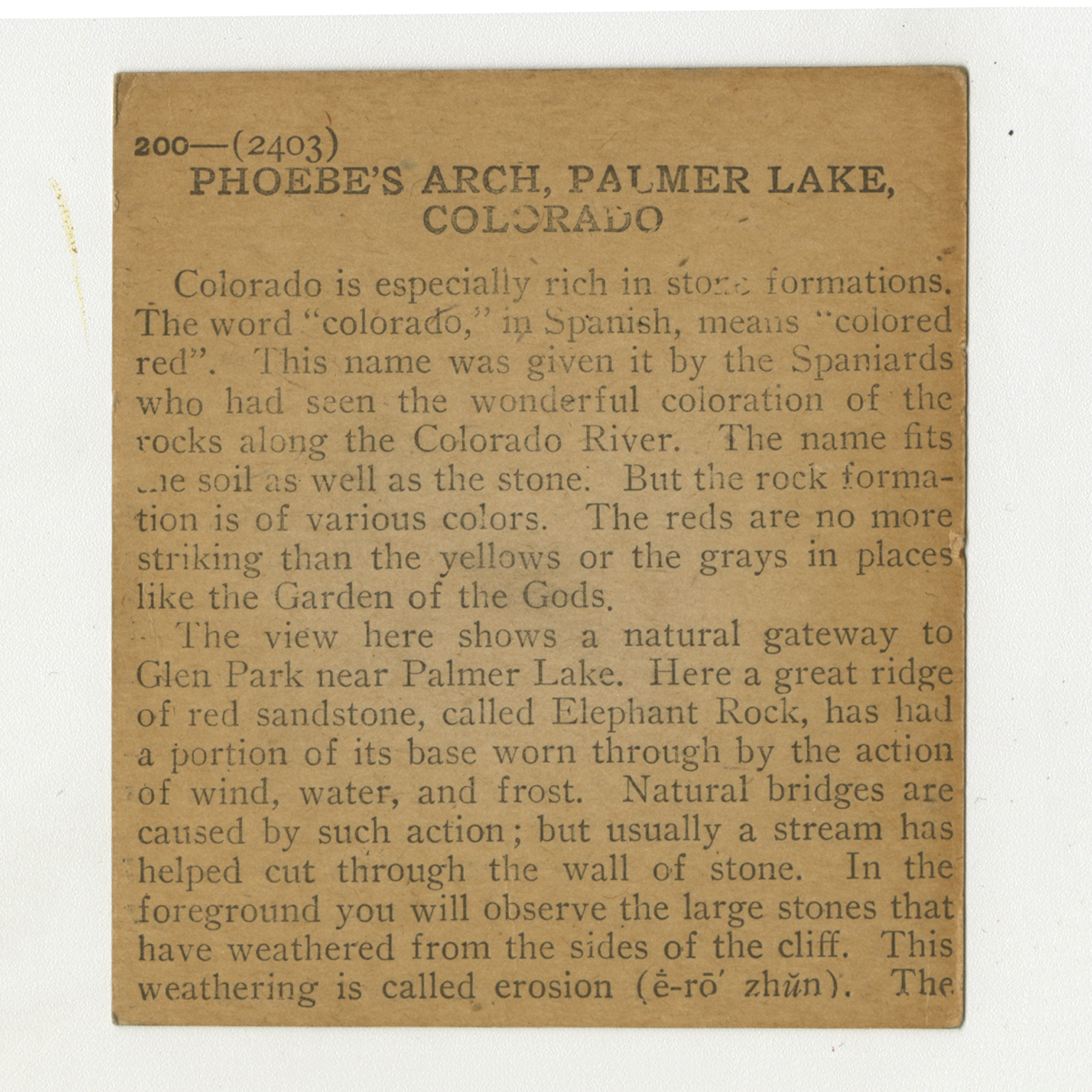 Colorado is especially rich in stone formations. The word "colorado" in Spanish means "colored red". This name was given it by the Spaniards who had seen the wonderful coloration of the rocks along the Colorado River. The name fits the soil as well as the stone. But the rock formation is of various colors. The reds are no more striking than the yellows or the grays in places like the Garden of the Gods. The view here shows a natural gateway to Glen Park near Palmer Lake. Here a great ridge of red sandstone, called Elephant Rock, has had a portion of its base worn through by the action of wind, water, and frost. Natural bridges are caused by such action; but usually a stream has helped cut through the wall of stone. In the foreground you will observe the large stones that have weathered from the sides of the cliff. This weathering is called erosion. The