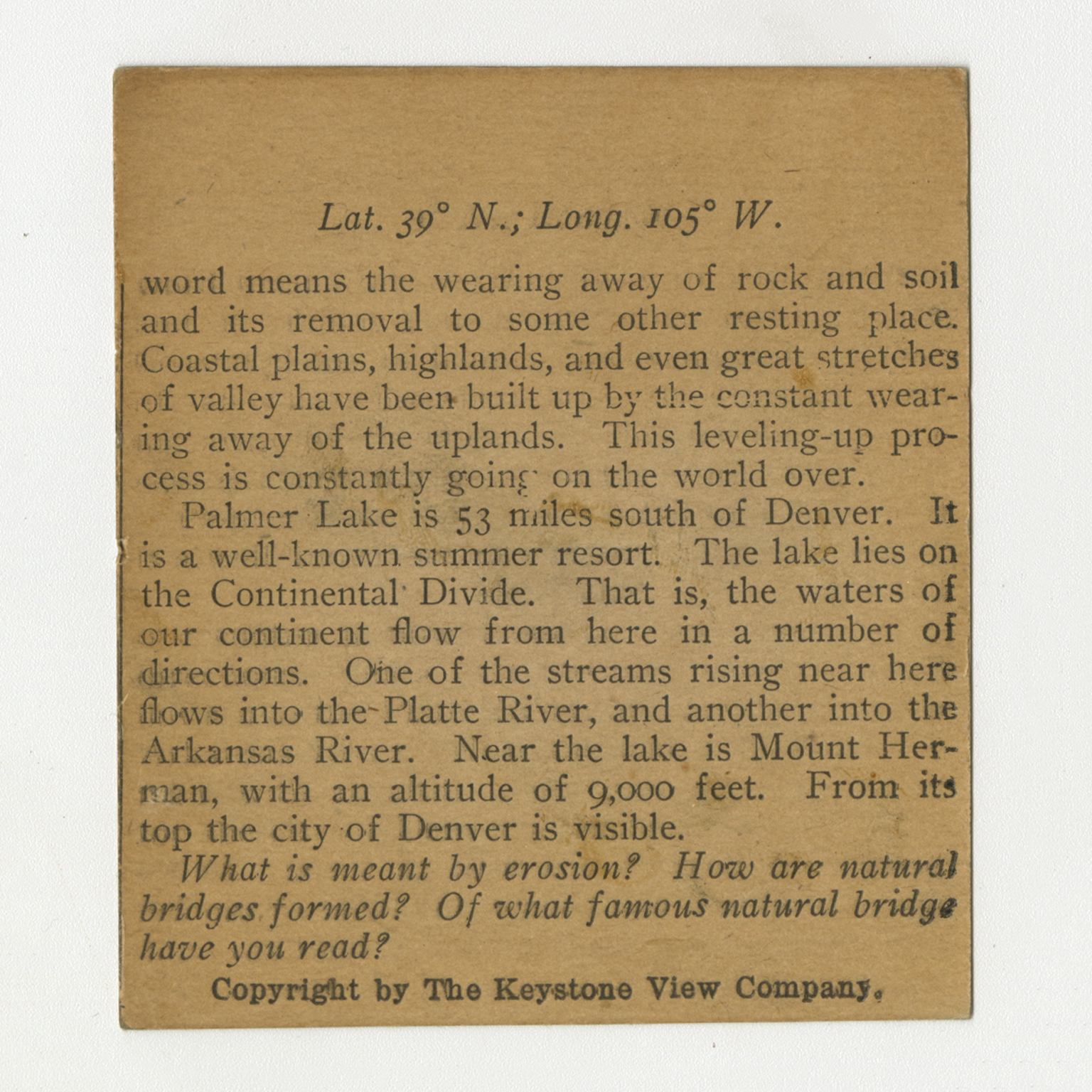 word means the wearing away of rock and soil and its removal to some other resting place. Coastal plains, highlands, and even great stretches of valley have been built up by the constant wearing away of the uplands. This leveling-up process is constantly going on the world over. Palmer Lake is 53 miles south of Denver. It is a well-known summer resort. The lake lies on the Continental Divide. That is, the waters of our continent flow from here in a number of directions. One of the streams rising near here flows into the Platte River, and another into the Arkansas River. Near the lake is Mount Herman, with an altitude of 9,000 feet. From its top the city of Denver is visible. What is meant by erosion? How are natural bridges formed? Of what famous natural bridge have you read?