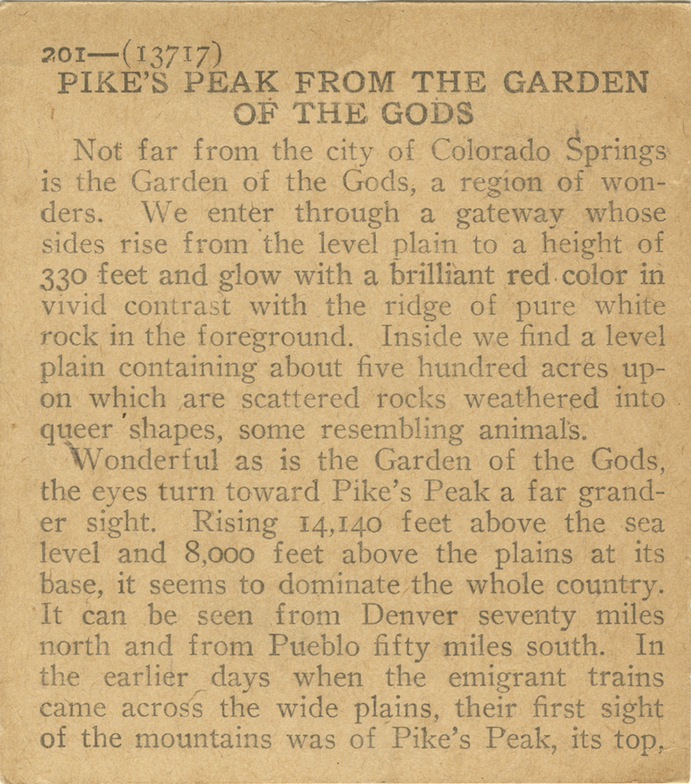 Not far from the city of Colorado Springs is the Garden of the Gods, a region of wonders. We enter through a gateway whose sides rise from the level plain to a height of 330 feet and glow with a brilliant red color in vivid contrast with the ridge of pure white rock in the foreground. Inside we find a level plain containing about five hundred acres upon which are scattered rocks weathered into queer shapes, some resembling animals. Wonderful as is the Garden of the Gods, the eyes turn toward Pike's Peak a far grander sight. Rising 14,140 feet above the sea level and 8,000 feet above the plains as its base, it seems to dominate the whole country. It can be seen from Denver seventy miles north and from Pueblo fifty miles south. In the earlier days when the emigrant trains came across the wide plains, their first sight of the mountains was of Pike's Peak, its top