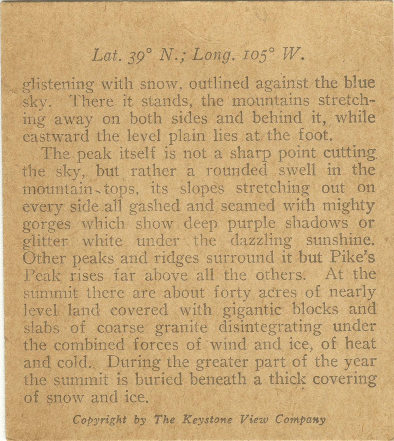 glistening with snow, outlined against the blue sky. There it stands, the mountains stretching away on both sides and behind it, while eastward the level plain lies at the foot. The peak itself is not a sharp point cutting the sky, but rather a rounded swell in the mountain tops, its slopes stretching out on every side all gashed and seamed with mighty gorges which show deep purple shadows or glitter while under the dazzling sunshine. Other peaks and ridges surround it but Pike's Peak rises far above all the others. At the summit there are about forty acres of nearly level land covered with gigantic blocks and slabs of coarse granite disintegrating under the combined forces of wind and ice, of heat and cold. During the greater part of the year the summit is buried beneath a thick covering of snow and ice.