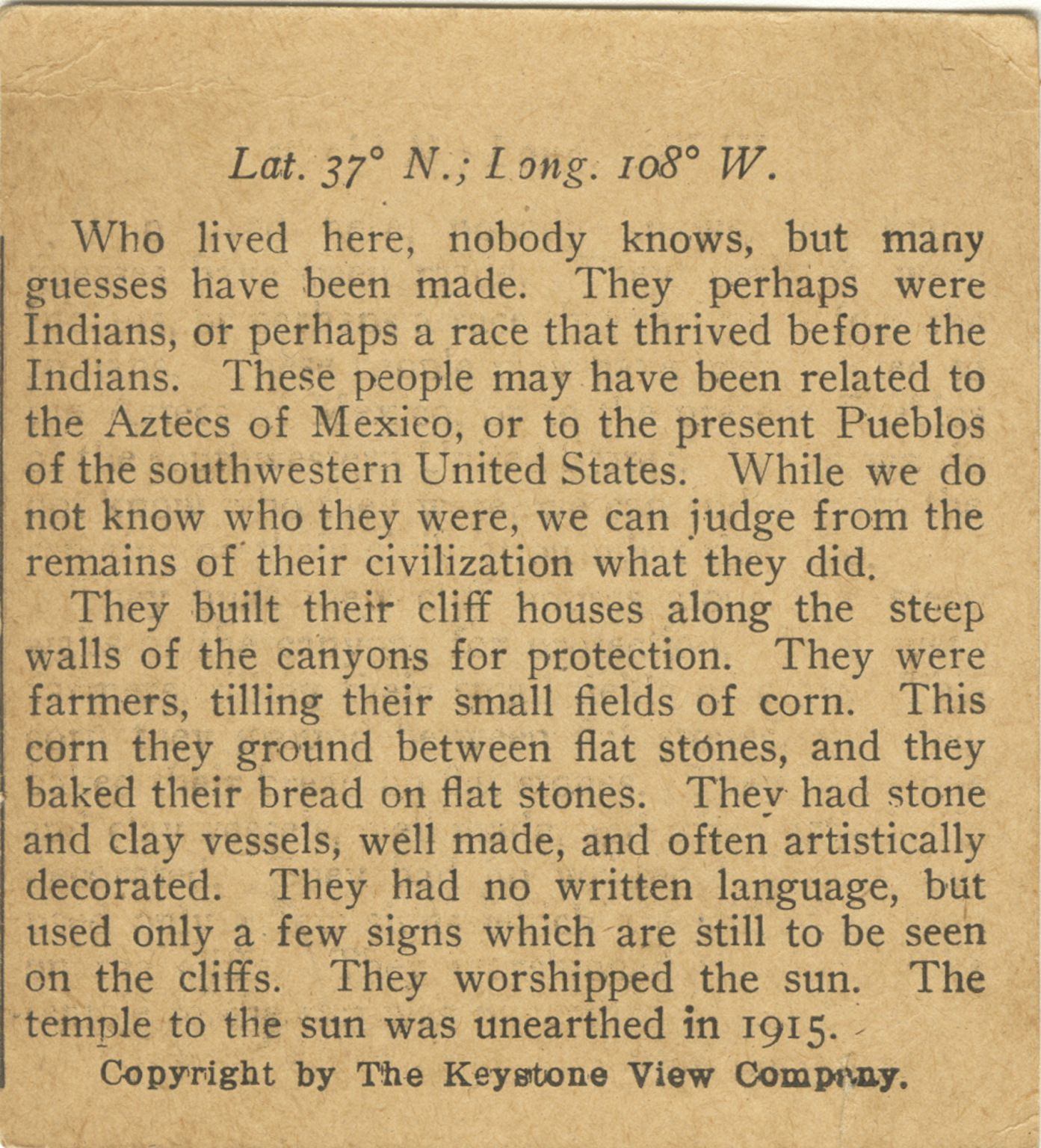Who lived here, nobody knows, but many guesses have been made. They perhaps were Indians, or perhaps a race that thrived before the Indians. These people may have been related to the Aztecs of Mexico, or to the present Pueblos of the southwestern United States. While we do not know who they were, we can judge from the remains of their civilization what they did. They built their cliff houses along the steep walls of the canyons for protection. They were farmers, tilling their small fields of corn. This corn they ground between flat stones, and they baked their bread on flat stones. They had stone and clay vessels, well made, and often artistically decorated. They had no written language, but used only a few signs which are still to be seen on the cliffs. They worshipped the sun. The temple to the sun was unearthed in 1915.