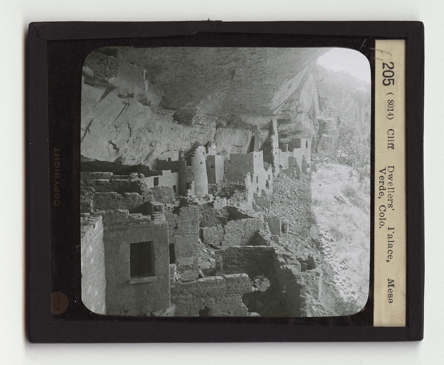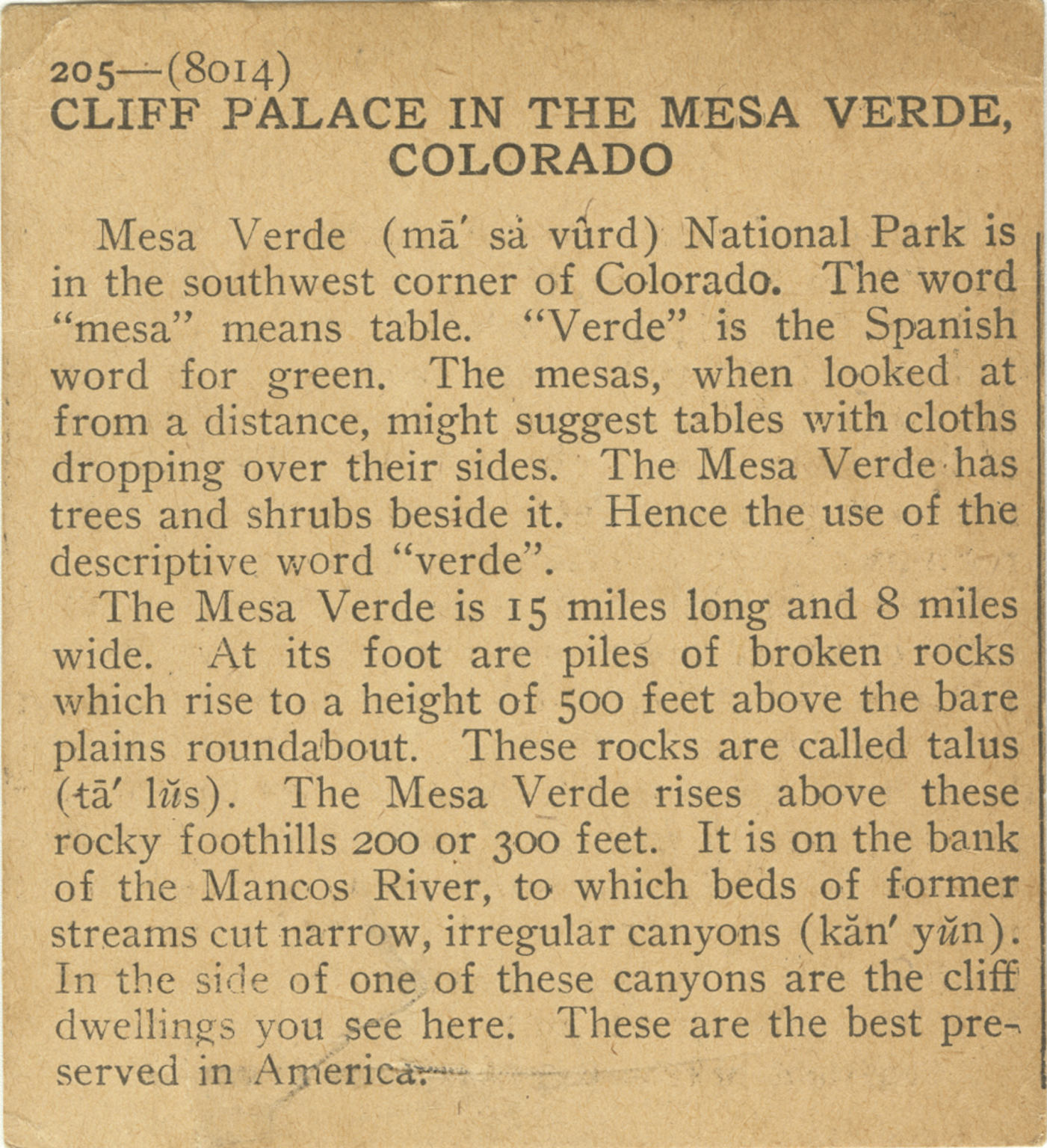 Mesa Verde National Park is in the southwest corner of Colorado. The word "mesa" means table. "Verde" is the Spanish word for green. The mesas, when looked at from a distance, might suggest tables with cloths dropping over their sides. The Mesa Verde has trees and shrubs beside it. Hence the use of the descriptive word "verde". The Mesa Verde is 15 miles long and 8 miles wide. At its foot are piles of broken rocks which rise to a height of 500 feet above the bare plains roundabout. These rocks are called talus. The Mesa Verde rises above these rocky foothills 200 or 300 feet. It is on the bank of the Mancos River, to which beds of former streams cut narrow, irregular canyons are the cliff dwellings you see here. These are the best preserved in America.