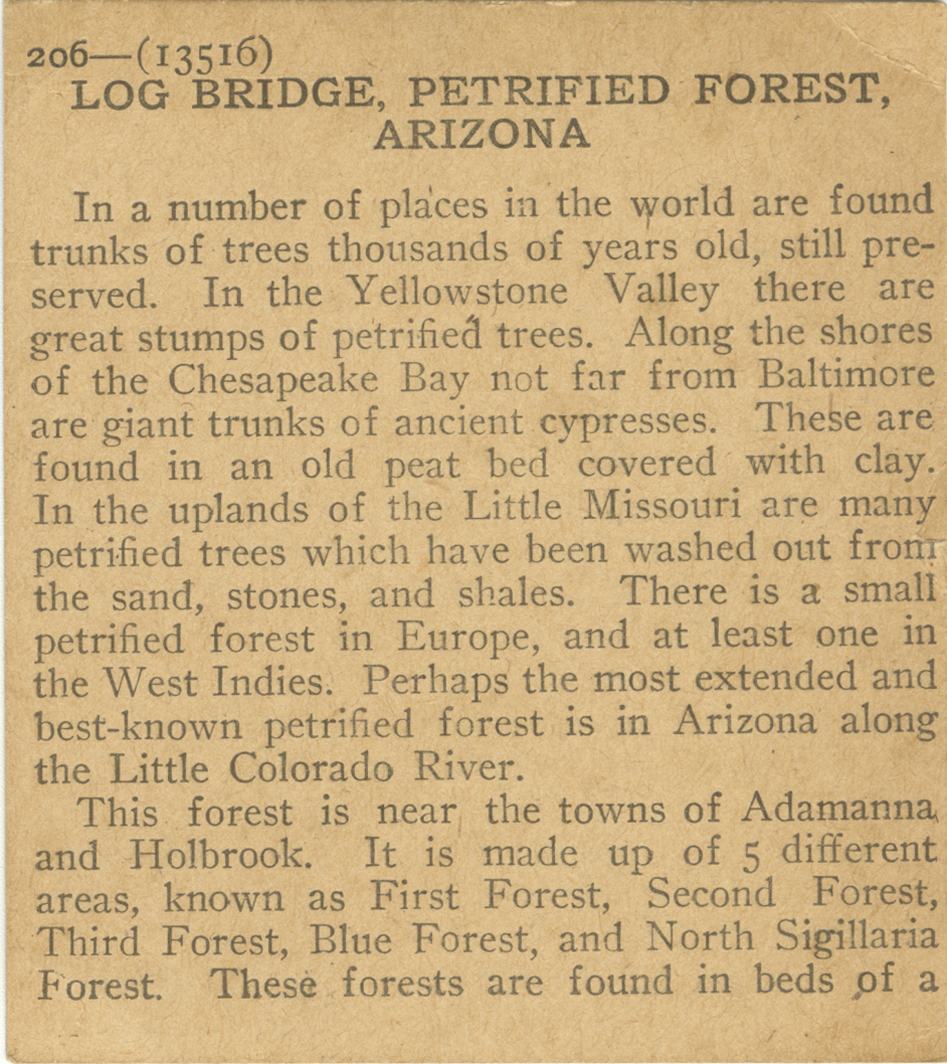 In a number of places in the world are found trunks of trees thousands of years old, still preserved. In Yellowstone Valley there are great stumps of petrified trees. Along the shores of the Chesapeake Bay not far from Baltimore are giant trunks of ancient cypresses. These are found in an old peat bed covered with clay. In the uplands of the Little Missouri are many petrified trees which have been washed out from the sand, stones, and shales. There is a small petrified forest in Europe, and at least one in the West Indies. Perhaps the most extended and best-known petrified forest is in Arizona along the Little Colorado River. This forest is near the towns of Adamanna and Holbrook. It is made up of 5 different areas, known as First Forest, Second Forest, Third Forest, Blue Forest and North Sigillaria Forest. These forests are found in beds of a