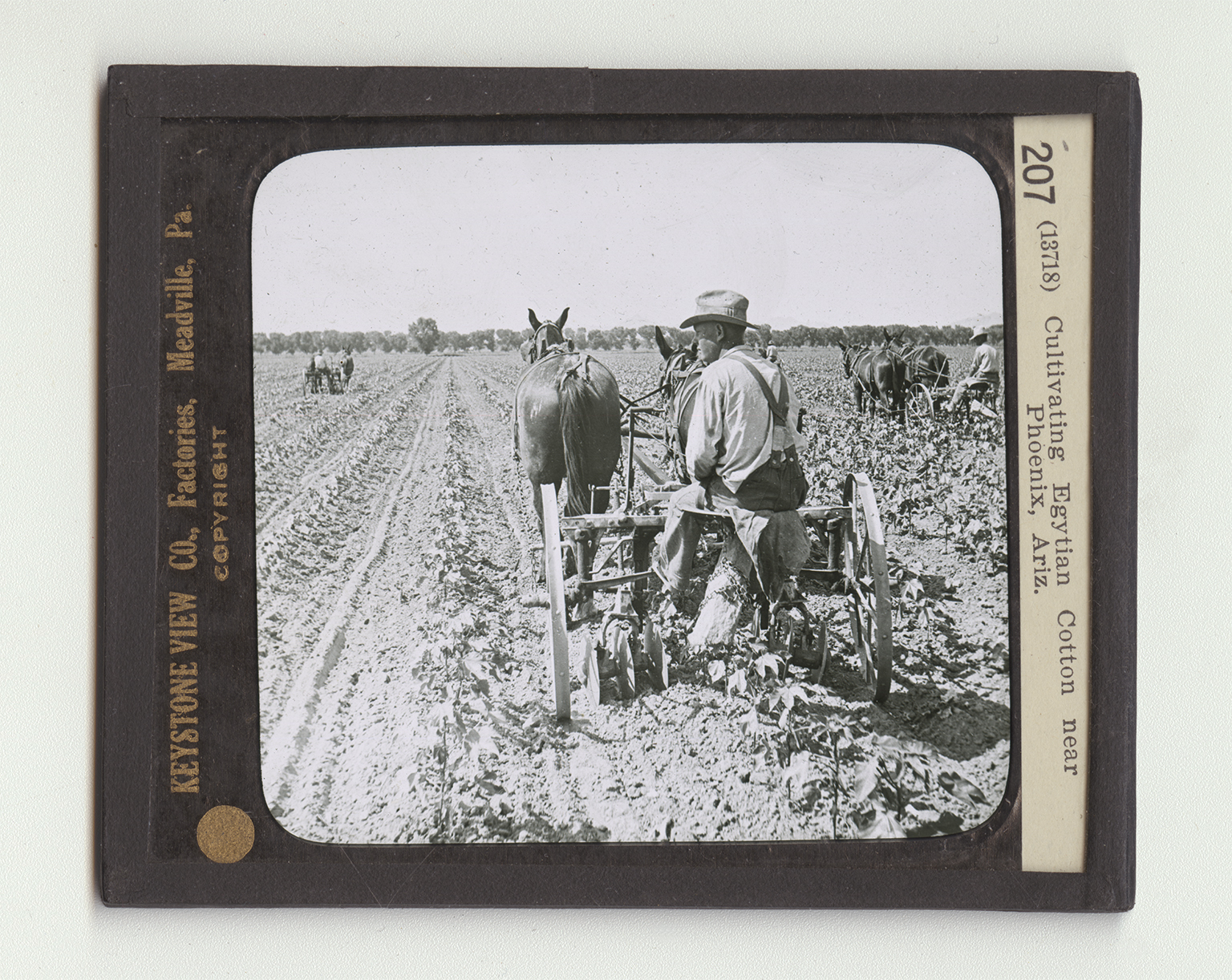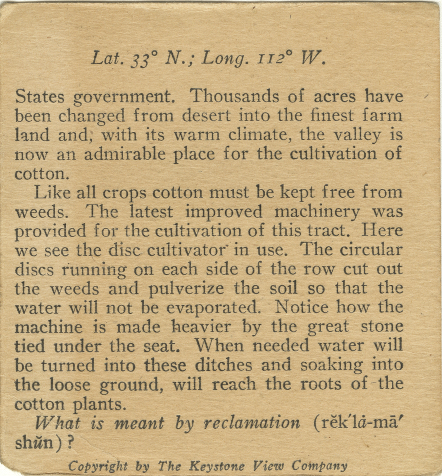States government. Thousands of acres have changed from desert into the finest farm land and, with its warm climate, the valley is now an admirable place for the cultivation of cotton. Like all crops cotton must be kept free from weeds. The latest improved machinery was provided for the cultivation of this tract. Here we see the disc cultivator in use. The circular discs running on each side of the row cut out the weeds and pulverize the soil so that the water will not be evaporated. Notice how the machine is made heavier by the great stone tied under the seat. When needed water will be turned into these ditches and soaking into the loose ground, will reach the roots of the cotton plants. What is meant by reclamation?