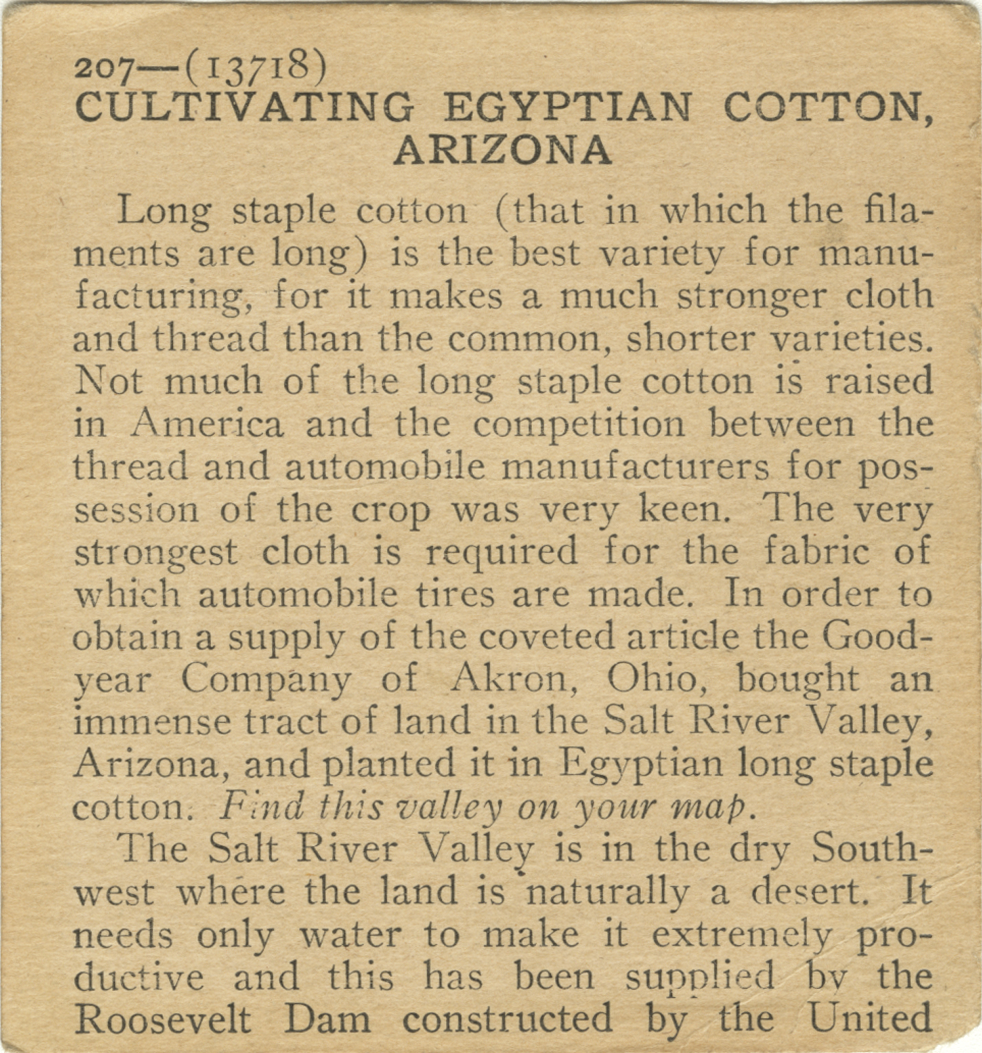 Long staple cotton (that in which the filaments are long) is the best variety for manufacturing, for it makes a much stronger cloth and thread than the common, shorter varieties. Not much of the long staple cotton is raised in America and the competition between the thread and automobile manufacturers for possession of the crop was very keen. The very strongest cloth is required for the fabric of which automobile tires are made. In order to obtain a supply of the coveted article the Goodyear Company of Akron, Ohio, bought an immense tract of land in the Salt River Valley, Arizona, and planted it in Egyptian long staple cotton. Find this valley on your map. The Salt River Valley is in the dry Southwest where the land is naturally a desert. It needs only water to make it extremely productive and this has been supplied by the Roosevelt Dam constructed by the United