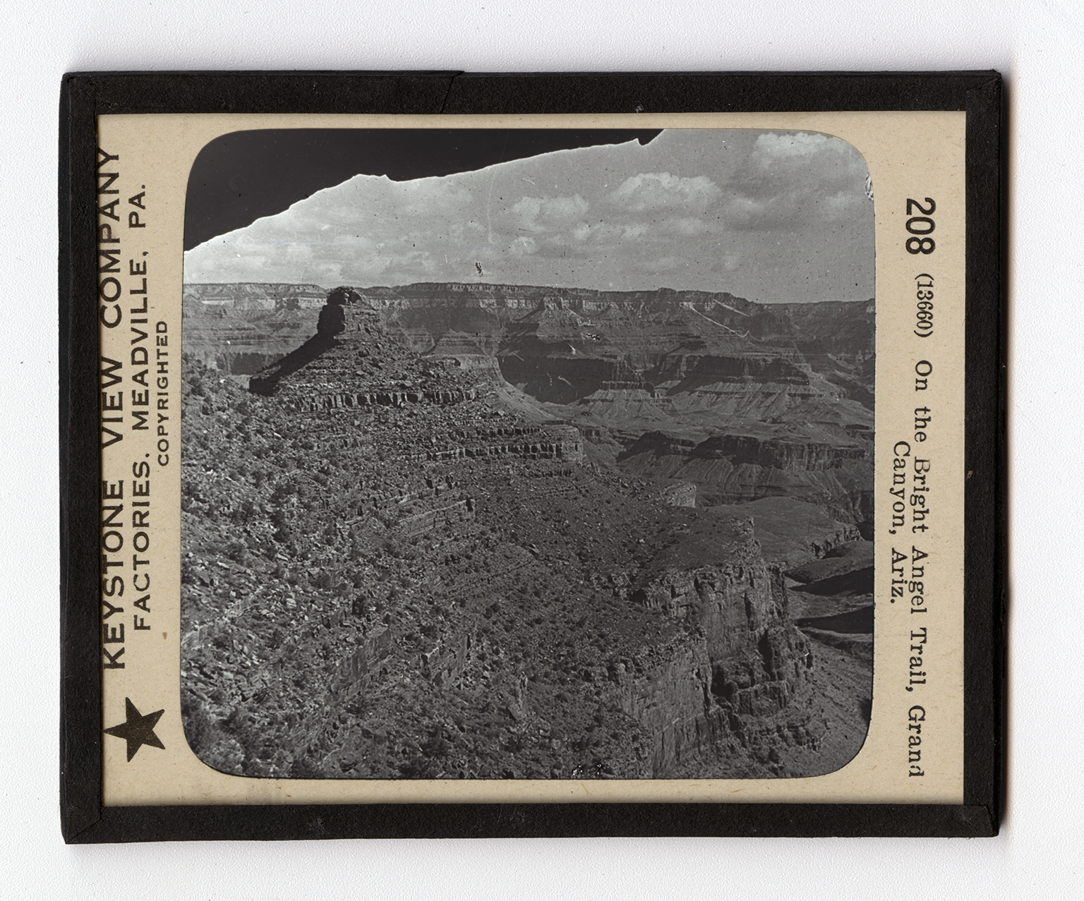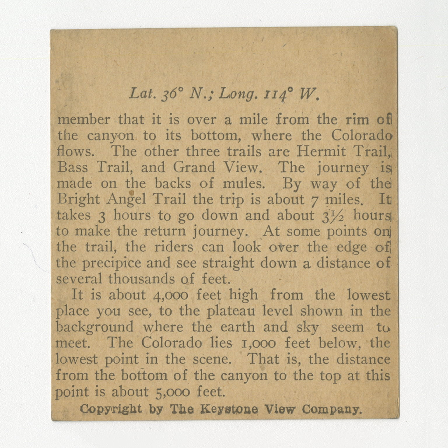 member that it is over a mile from the rim of the canyon to its bottom, where the Colorado flows. The other three trails are Hermit Trail, Bass Trail, and Grand View. The journey is made on the backs of mules. By the way of the Bright Angel Trail the trip is about 7 miles. It takes 3 hours to go down and about 3 1/2 hours to make the return journey. At some points on the trail, the riders can look over the edge of the precipice and see straight down a distance of several thousands of feet. It is about 4,000 feet high from the lowest place you see, to the plateau level shown in the background where the earth and sky seem to meet. The Colorado lies 1,000 feet below, the lowest point in the scene. That is, the distance from the bottom of the canyon to the top at this point is about 5,000 feet.
