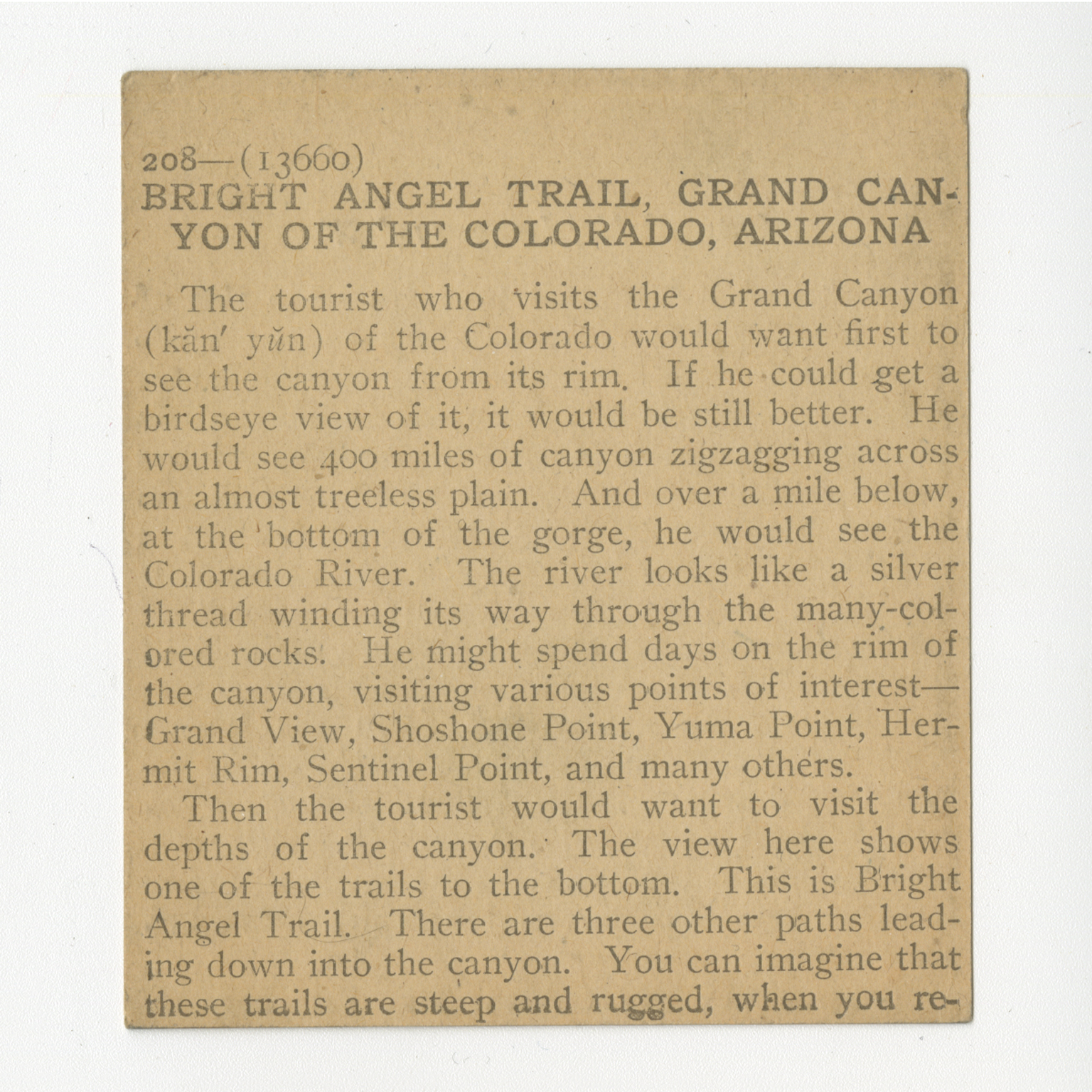 The tourist who visits the Grand Canyon of the Colorado would want first to see the canyon from its rim. If he could get a birdseye view of it, it would be still better. He would see 400 miles of canyon zigzagging across an almost treeless plain. And over a mile below, at the bottom of the gorge, he would see the Colorado River. The river looks like a silver thread winding its way through the many-colored rocks. He might spend days on the rim of the canyon, visiting various points of interest - Grand View, Shoshone Point, Yuma Point, Hermit Rim, Sentinel Point, and many others. Then the tourist would want to visit the depth of the canyon. The view here shows one of the trails to the bottom. This is Bright Angel Trail. There are three other paths leading down into the canyon. You can imagine that these trails are steep and rugged, when you re-
