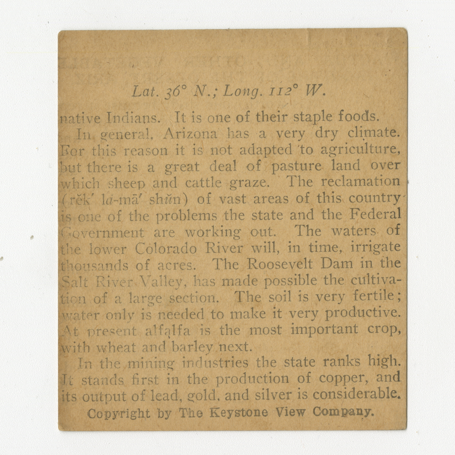 native Indians. It is one of their staple foods. In general, Arizona has a very dry climate. For this reason it is not adapted to agriculture, but there is a great deal of pasture land over which sheep and cattle graze. The reclamation of vast areas of this country is one of the problems the state and the Federal Government are working out. The waters of the lower Colorado River will, in time, irrigate thousands of acres. The Roosevelt Dam in the Salt River Valley, has made possible the cultivation of a large section. The soil is very fertile; water only is needed to make it very productive. At present alfalfa is the most important crop, with wheat and barley next. In the mining industries the state ranks high. It stands first in the production of copper, and its output of lead, gold, and silver is considerable.