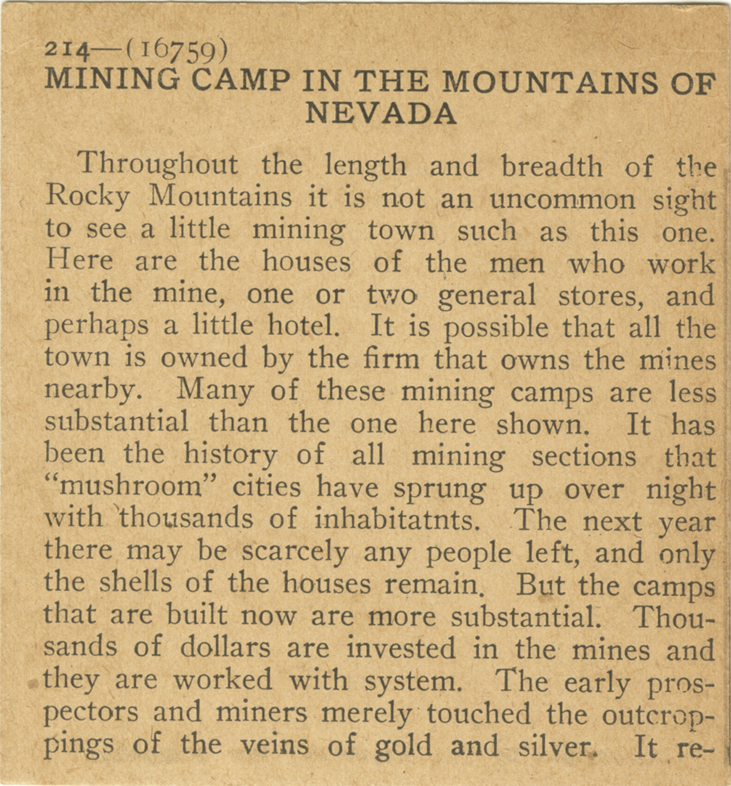 Throughout the length and breadth of the Rocky Mountains it is not an uncommon sight to see a little mining town such as this one. Here are the houses of the men who work in the mine, one or two general stores, and perhaps a little hotel. It is possible that all the town is owned by the firm that owns the mines nearby. Many of these mining camps are less substantial than the one here shown. It has been the history of all mining sections that "mushroom" cities have sprung up over night with thousands of inhabitants. The next year there may be scarcely any people left, and only the shells of the houses remain. But the camps that are built now are more substantial. Thousands of dollars are invested in the mines and they are worked with system. The early prospectors and miners merely touched the outcroppings of the veins of gold and silver. It re-