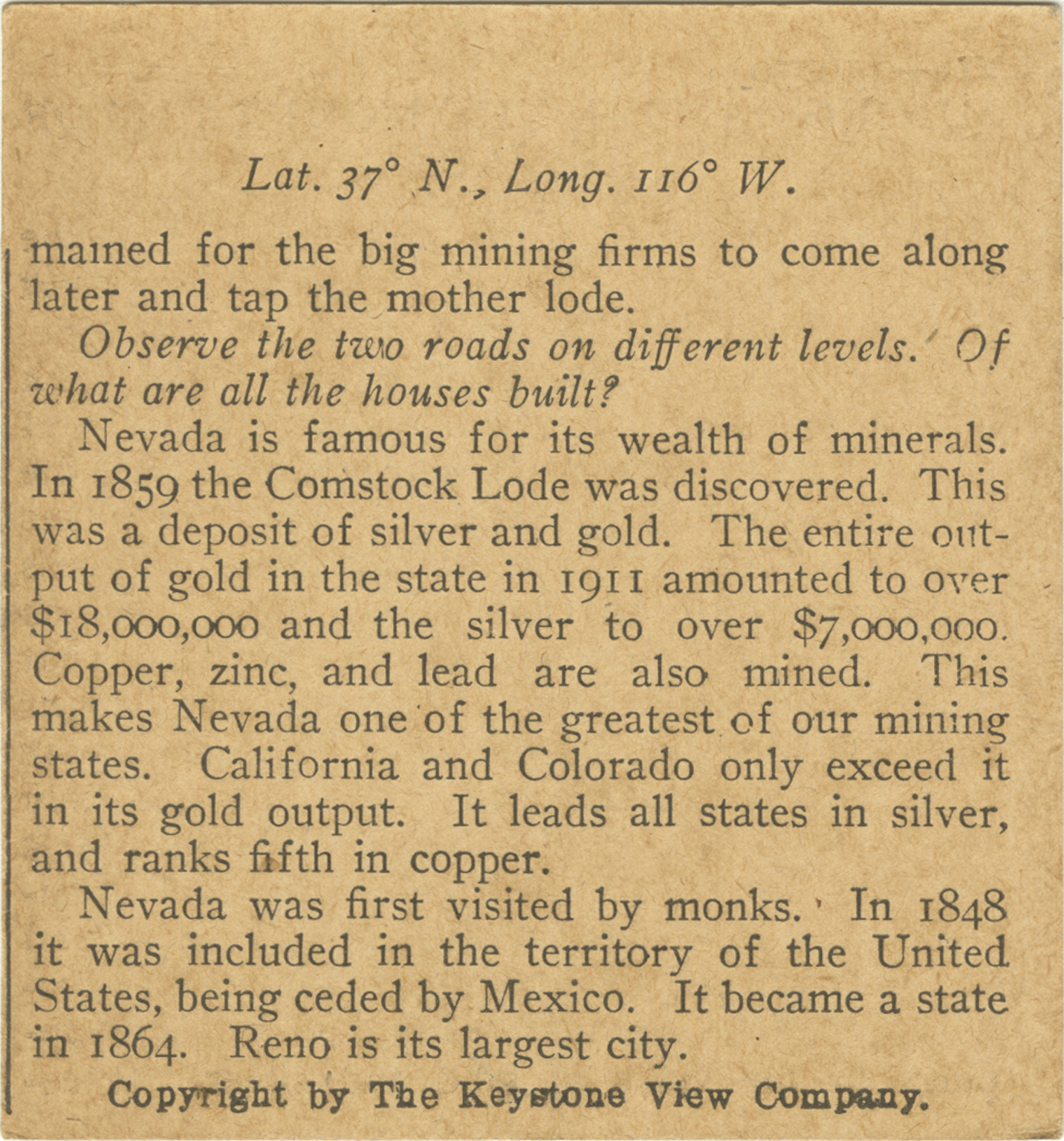mained for the big mining firms to come along later and tap the mother lode. Observe the two roads on different levels. Of what are all the houses built? Nevada is famous for its wealth of minerals. In 1859 the Comstock Lode was discovered. This was a deposit of silver and gold. The entire output of gold in the state in 1911 amounted to over $18,000,000 and the silver to over $7,000,000. Copper, zinc, and lead are also mined. This makes Nevada one of the greatest of our mining states. California and Colorado only exceed it in its gold output. It leads all states in silver, and ranks fifth in copper. Nevada was first visited by monks. In 1848 it was included in the territory of the United States, being ceded by Mexico. It became a state in 1864. Reno is its largest city.