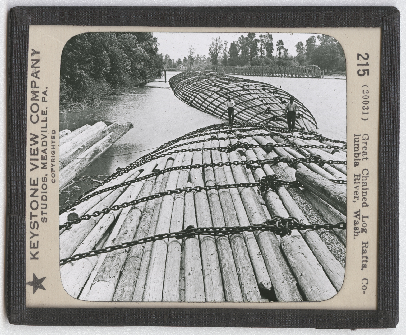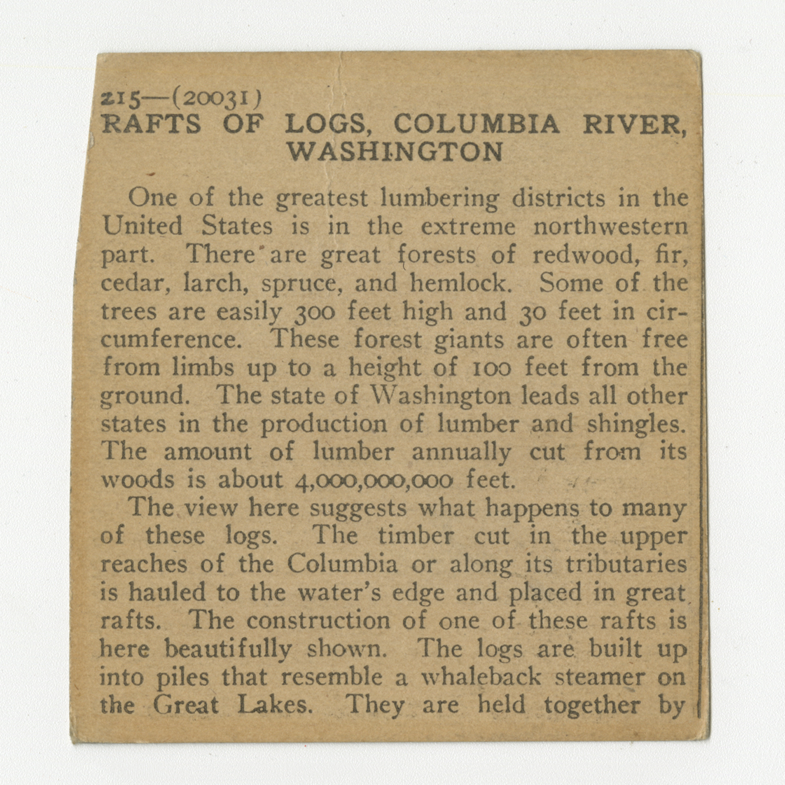One of the greatest lumbering districts in the United States is in the extreme northwestern part. These are great forests of redwood, fir, cedar, larch, spruce, and hemlock. Some of the trees are easily 300 feet high and 30 feet in circumference. These forests giants are often free from limbs up to a height of 100 feet from the ground. The state of Washington leads all other states in the production of lumber and shingles. The amount of lumber annually cut from its woods is about 4,000,000,000 feet. The view here suggests what happens to many of these logs. The timber cut in the upper reaches of the Columbia or along its tributaries is hauled to the water's edge and placed in great rafts. The construction of one of these rafts is here beautifully shown. The logs are built up into piles that resemble a whaleback steamer on the Great Lakes. They are held together by