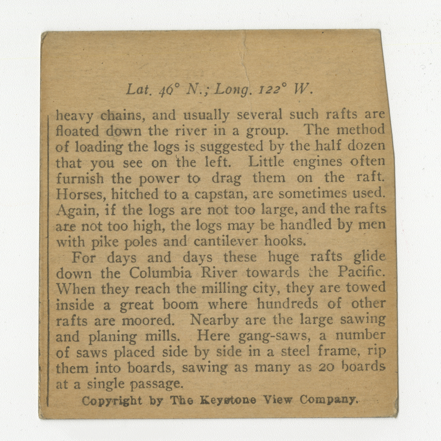 heavy chains, and usually several such rafts are floated down the river in a group. The method of loading the logs is suggested by the half dozen that you see on the left. Little engines often furnish the power to drag them on the raft. Horses, hitched to a capstan, are sometimes used. Again, if the logs are not too large, and the rafts are not too high, the logs may be handled by men with pike poles and cantilever hooks. For days and days these huge rafts glide down the Columbia River towards the Pacific. When they reach the milling city, they are towed inside a great boom where hundreds of other rafts are moored. Nearby are the large sawing and planing mills. Here gang-saws, a number of saws placed side by side in a steel frame, rip them into boards, sawing as many as 20 boards at a single passage.