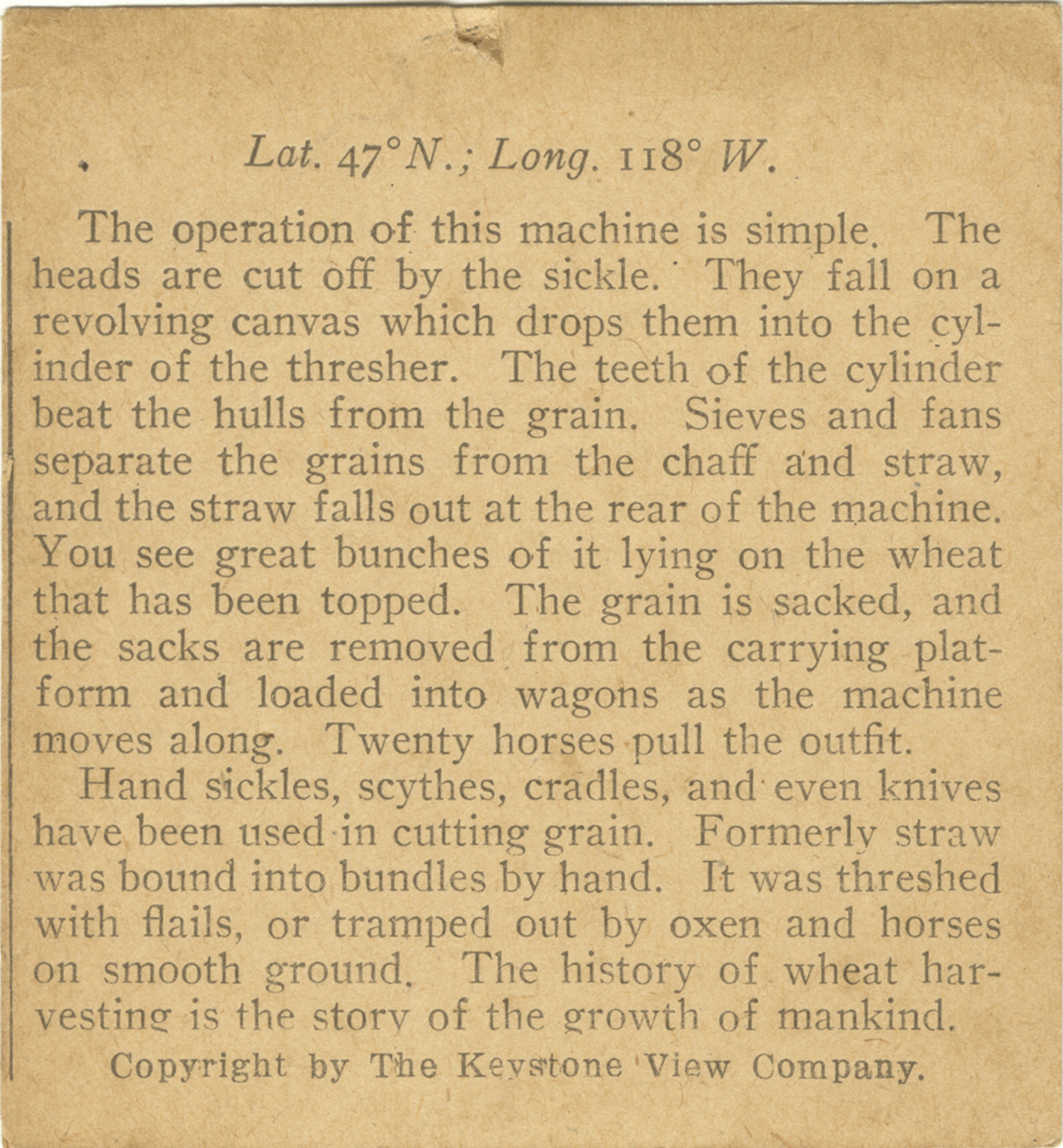 The operation of this machine is simple. The heads are cut off by the sickle. They fall on a revolving canvas which drops them into the cylinder of the thresher. The teeth of the cylinder beat the hulls from the grain. Sieves and fans separate the grains from the chaff and straw, and the straw falls out at the rear of the machine. You see great bunches of it lying on the wheat that has been topped. The grain is sacked, and the sacks are removed from the carrying platform and loaded into wagons as the machine moves along. Twenty horses pull the outfit. Hand sickles, scythes, cradles, and even knives have been used in cutting grain. Formerly straw was bound into bundles by hand. It was threshed with flails, or tramped out by oxen and horses on smooth ground. The history of wheat harvesting is the story of the growth of mankind.