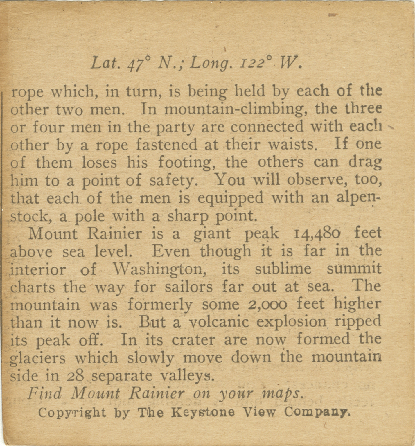rope, which, in turn, is being held by each of the other two men. In mountain-climbing, the three of four men in the party are connected with each other by a rope fastened at their waists. If one of them loses his footing, the others can drag him to a point of safety. You will observe, too, that each of the men is equipped with an alpenstock, a pole with a sharp point. Mount Rainier is a giant peak 14,480 feet above sea level. Even though it is far in the interior of Washington, its sublime summit charts the way for sailors far out at sea. The mountain was formerly some 2,000 feet higher than it now is. But a volcanic explosion ripped its peak off. In its crater are now formed the glaciers which slowly move down the mountain side in 28 separate valleys. Find Mount Rainier on your maps.