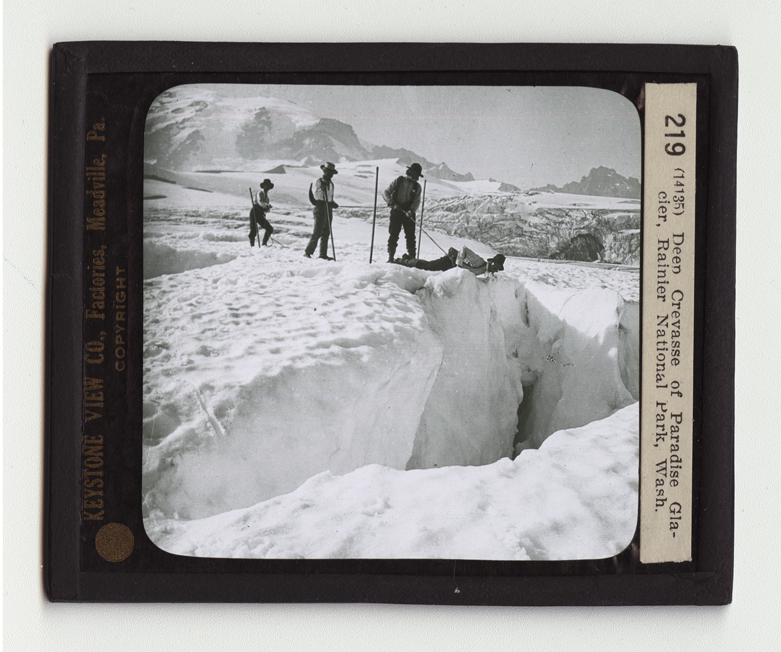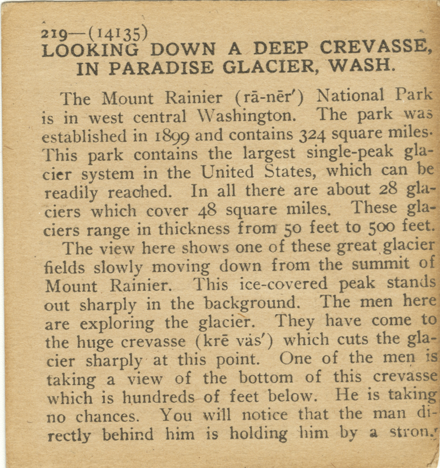 The Mount Rainier National Park is in west central Washington. The park was established in 1899 and contains 324 square miles. This park contains the largest single-peak glacier system in the United States, which can be readily reached. In all there are about 28 glaciers which cover 48 square miles. These glaciers range in thickness from 50 feet to 500 feet. The view here shows one of these great glacier fields slowly moving down from the summit of Mount Rainier. This ice-covered peak stands out sharply in the background. The men here are exploring the glacier. They have come to the huge crevasse which cuts the glacier sharply at this point. One of the men is taking a view of the bottom of this crevasse which is hundreds of feet below. He is taking no chances. You will notice that the man directly behind him is holding him by a strong