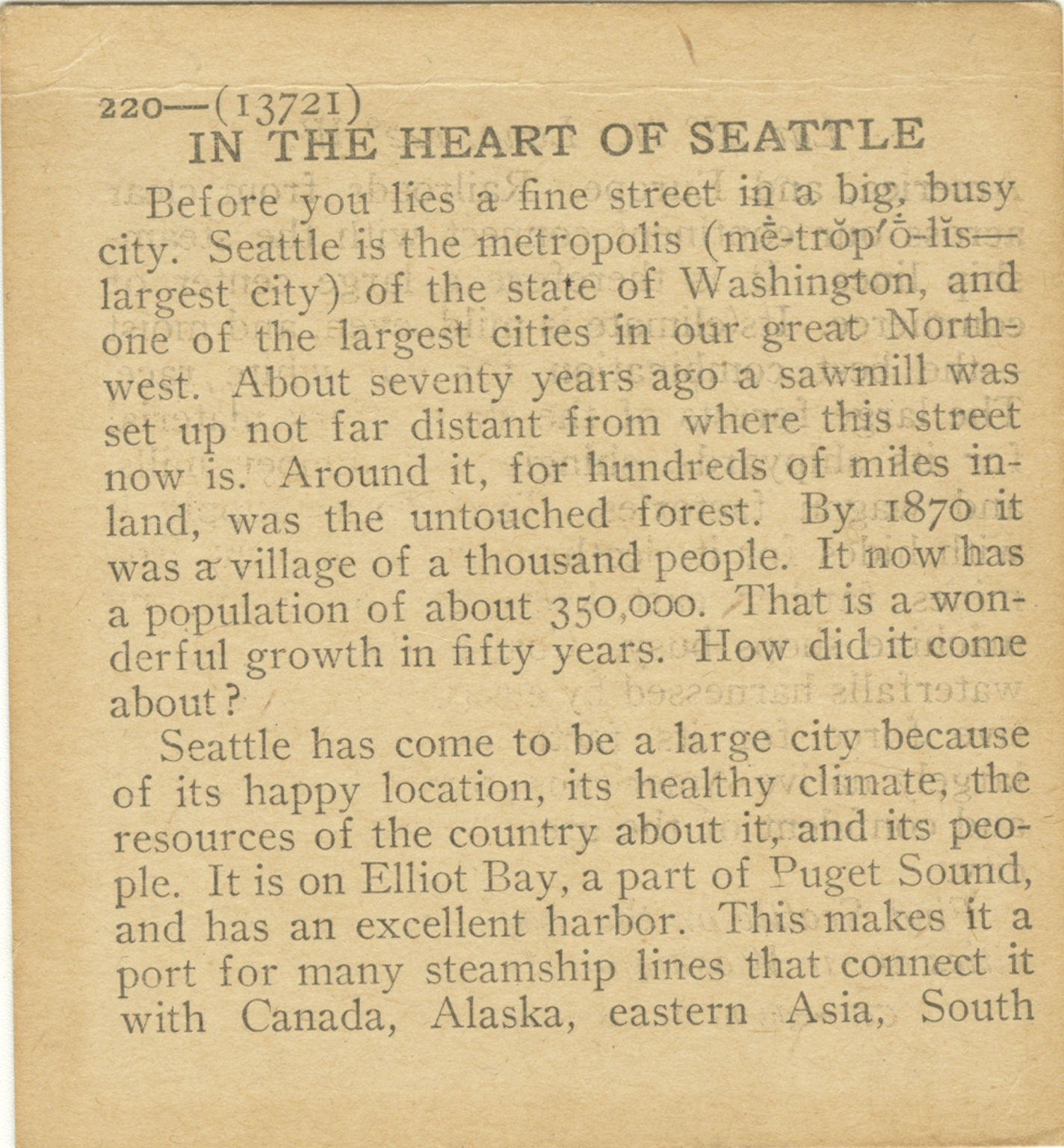 Before you lies a fine street in a big, busy, city. Seattle is the metropolis of the state of the state of Washington, and one of the largest cities in our great Northwest. About seventy years ago a sawmill was set up not far distant from where this street now is. Around it, for hundreds of miles inland, was the untouched forest. By 1870 it was a village of a thousand people. It now has a population of about 350,000. That is a wonderful growth in fifty years. How did it come about? Seattle has come to be a large city because of its happy location, its healthy climate, the resources of the country about it, and its people. It is on Elliot Bay, a part of Puget Sound, and has an excellent harbor. This makes it a port for many steamship lines that connect it with Canada, Alaska, eastern Asia, South