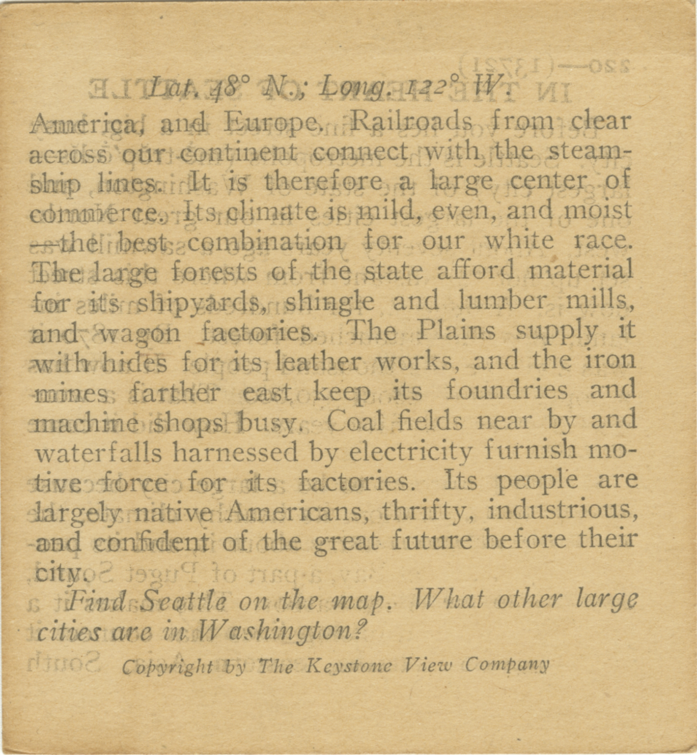 America, and Europe. Railroads from clear across our continent connect with the steamship lines. It is therefore a large center of commerce. Its climate is mild, even, and moist - the best combination for our white race. The large forests of the state afford material for its shipyards, shingle and lumber mills, and wagon factories. The Plains supply it with hides for its leather works, and the iron mines farther east keep its foundries and machine shops busy. Coal fields near by and waterfalls harnessed by electricity furnish motive force for its factories. Its people are largely native Americans, thrifty, industrious, and confident of the great future before their city. Find Seattle on the map. What other large cities are in Washington?