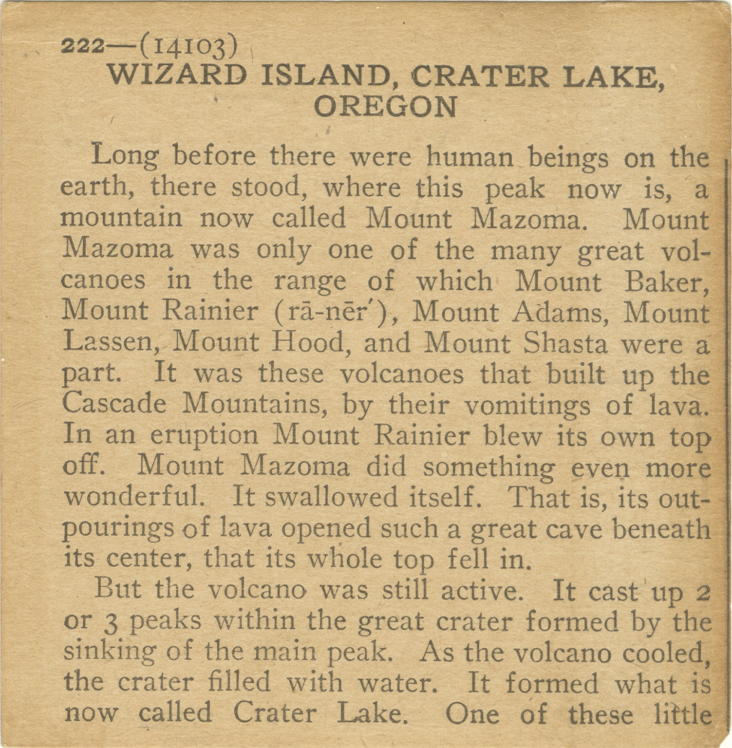 Long before there were human beings on the earth, there stood, where this peak now is, a mountain now called Mount Mazoma. Mount Mazoma was only one of the many great volcanoes in the range of which Mount Baker, Mount Rainier, Mount Adams, Mount Lassen, Mount Hood, and Mount Shasta were a part. It was these volcanoes that built up the Cascade Mountains, by their vomitings of lava. In an eruption Mount Rainier blew its own top off. Mount Mazoma did something even more wonderful. It swallowed itself. That is, its outpourings of lava opened such a great cave beneath its center, that its whole top fell in. But the volcano was still active. It cast up 2 or 3 peaks within the great crater formed by the sinking of the main peak. As the volcano cooled, the crater filled with water. It formed what is now called Crater Lake. One of these little