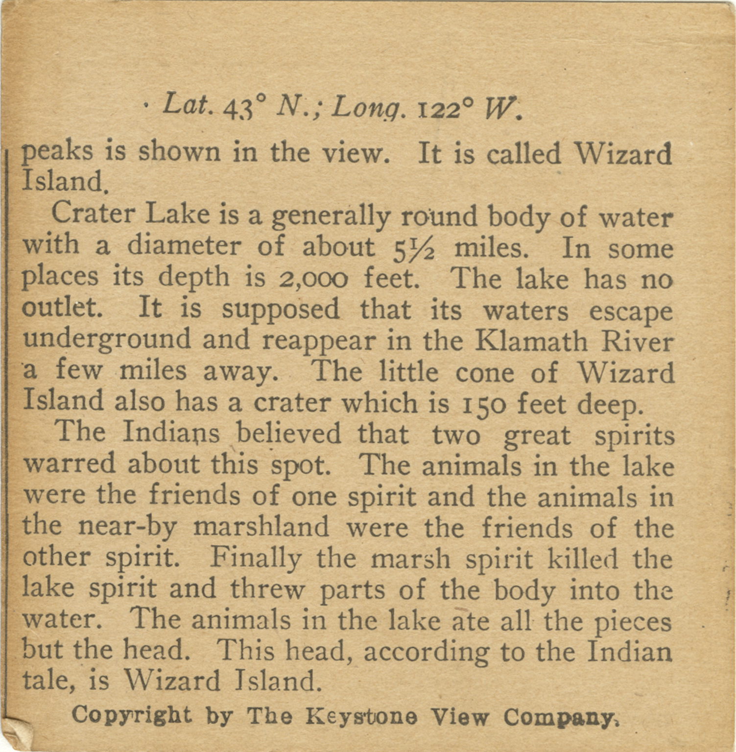 peaks is shown in the view. It is called Wizard Island. Crater Lake is a generally round body of water with a diameter of about 5 1/2 miles. In some places its depth is 2,000 feet. The lake has no outlet. It is supposed that its waters escape underground and reappear in the Klamath River a few miles away. The little cone of Wizard Island also has a crater which is 150 feet deep. The Indians believed that two great spirits warred about this spot. The animals in the lake were the friends of one spirit and the animals in the lake were the friends of one spirit and the animals in the near-by marshland were the friends of the other spirit. Finally the marsh spirit killed the lake spirit and threw parts of the body into the water. The animals in the lake ate all the pieces but the head. This head, according to the Indian tale, is Wizard Island.