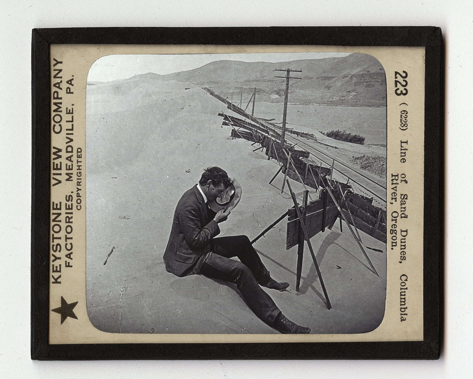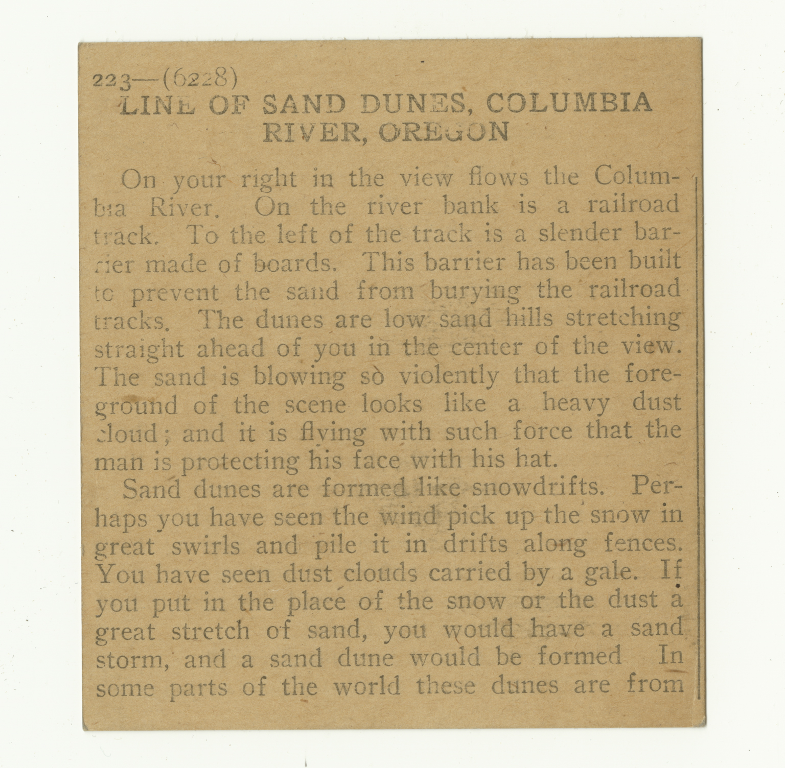 On your right in the view flows the Columbia River. On the river bank is a railroad track. To the left of the track is a slender barrier made of boards. This barrier has been built to prevent the sand from burying the railroad tracks. The dunes are low sand hills stretching straight ahead of you in the center of the view. The sand is blowing so violently that the foreground of the scene looks like a heavy dust cloud; and it is flying with such force that the man is protecting his face with his hat. Sand dunes are formed like snowdrifts. Perhaps you have seen the wind pick up the snow in great swirls and pile it in drifts along fences. You have seen dust clouds carried by a gale. If you put in the places of the snow or the dust a great stretch of sand, you would have a sand storm, and a sand dune would be formed. In some parts of the world these dunes are from